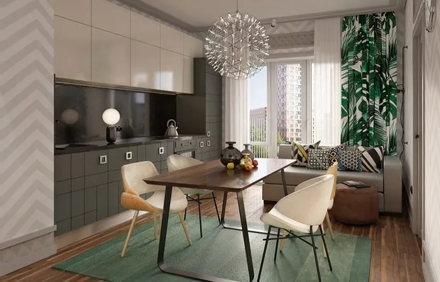 Wichtig ist, dass in dieser Wohnung wie auch in vielen kleinen, keine voluminösen und herabhängenden Leuchtern von der Decke vorhanden sind. Maximal – eine Leuchtertablette.
