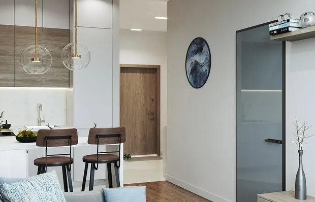 Um den Raum nicht in zwei Teile zu teilen, wurden die Wände in der Farbe der Decke bemalt. So sieht die Wohnung visuell größer aus. Der Akzent bildet die blaue Wand und der Dekor.