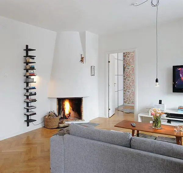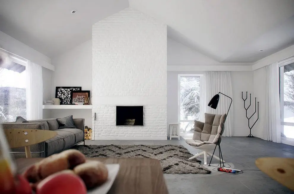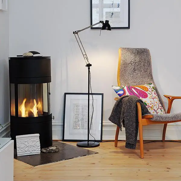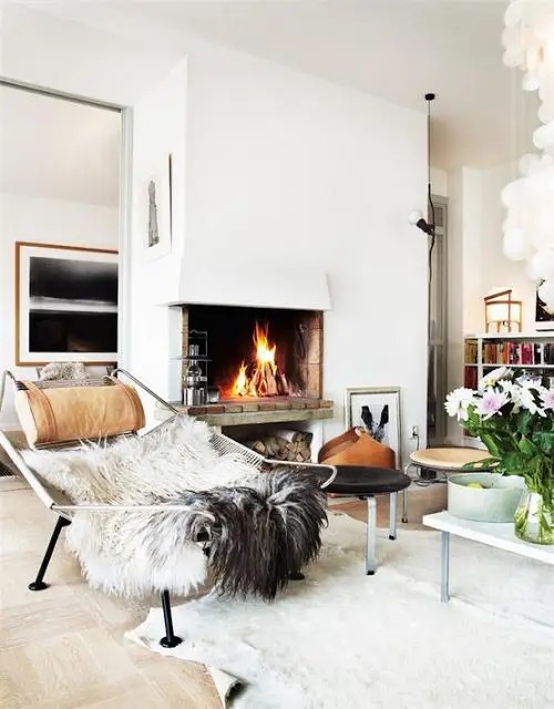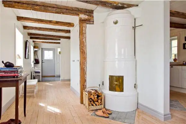 Die auffälligsten Elemente im skandinavischen Stil sind der Kamin oder eine freistehende Ofenwand. Leider ist die Installation solcher Elemente in unseren Wohnungen praktisch unmöglich, aber denken Sie daran, dies im Ferienhaus zu berücksichtigen. Ein Ofen ist sowohl nützlich als auch ästhetisch ansprechend in Schlafzimmern und Wohnzimmern. Ein stilvoller Wärmequelle wird in der Ecke platziert, um Ordnung zu wahren, kann aber trotzdem das Zentrum des gesamten Interieurs werden.