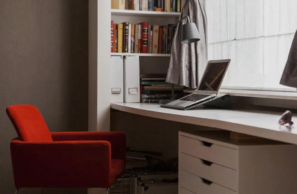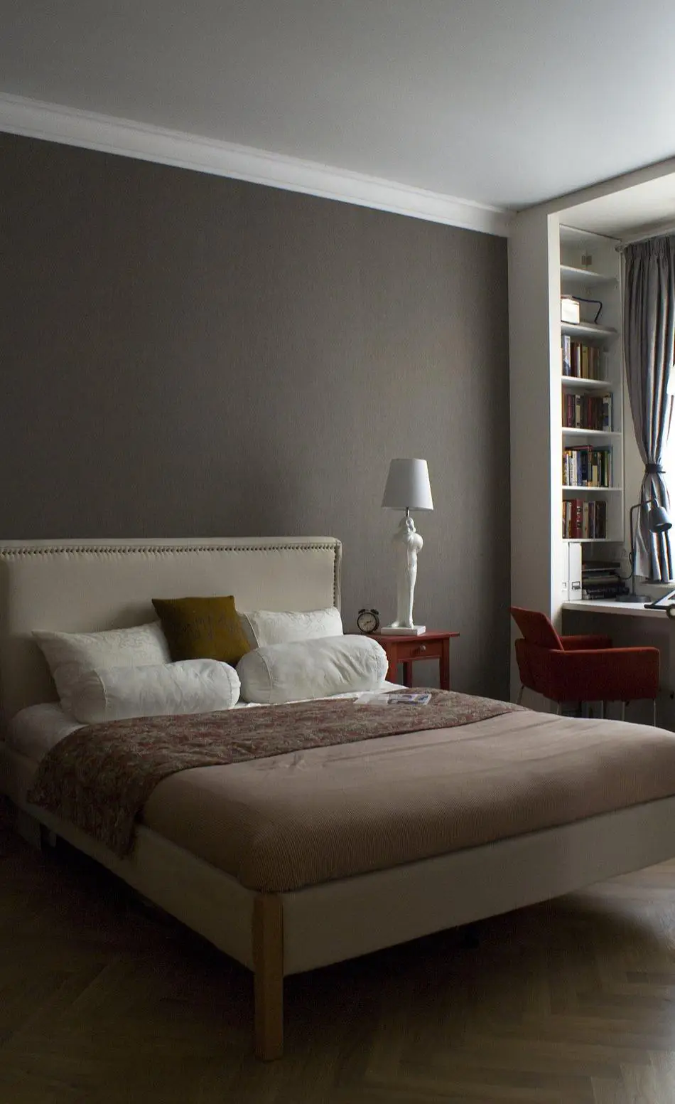 Im Elternschlafzimmer befindet sich ein Arbeitsplatz am Fenster. Die beiden Hauptfarben sind Weiß und Grau. Dieser neutrale Hintergrund ermöglicht die Kombination antiker und moderner Formen.