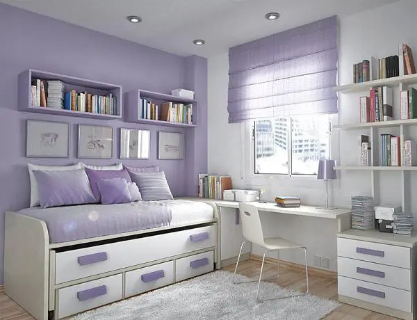 Aber das bedeutet nicht, dass alles vollgestopft werden muss. Ein großer Tisch reicht aus. Auch einige Wandregale oder Nachttische können helfen. Modularer Möbel ist ideal für ein solches Zimmer. Achten Sie darauf, die Regale so zu platzieren, dass das Mädchen alles leicht erreichen und verstauen kann.