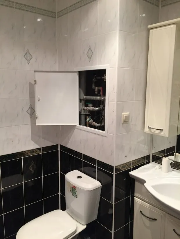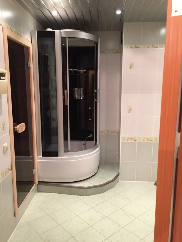 Das Badezimmer war vor der Renovierung mit Kacheln mit dekorativen Bordüren ausgelegt. Es gab auch eine Duschkabine auf einem Podium.