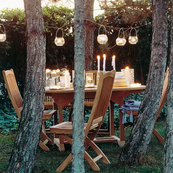 Beleuchten Sie das angrenzende Grundstück. Verwenden Sie tragbare Gartelampen oder hängende Lichterketten. Gleich gut aussehende Alternativen sind selbstgemachte Beleuchtungsaccessoires – verschiedene Varianten mit Kerzen.