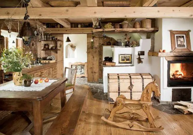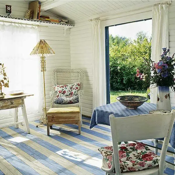 Wenn Ihr Landhaus aus Holzdielen besteht, überprüfen Sie zunächst deren Zustand. Da die Datscha über einen Großteil des Jahres ungenutzt bleibt und die Räume nicht beheizt werden, besteht die Gefahr, dass einige Bretter verfault sind. Ersetzen Sie beschädigte Teile und lackieren oder streichen Sie die gesamte Fläche – das verlängert die Lebensdauer Ihres Bodens. Kreative Lösungen beim Streichen können die Stimmung des Raums vollständig verändern. Wählen Sie kontrastreiche Farben oder sogar mehrere.
