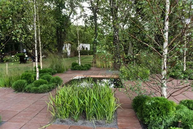 Auch kann man Pflaster oder Schiefer verwenden. Wenn man mit Stein selbst arbeiten schwer ist, ist es besser, sich an Holz zu wenden. Zum Beispiel können Wege aus Holz gemacht werden, nicht aus Betonkonstruktionen. Es wäre gut, im Design Wasser zu verwenden, damit der Garten maximal umweltfreundlich ist. Das können kleine Springbrunnen, Teiche oder Wasserfälle sein.