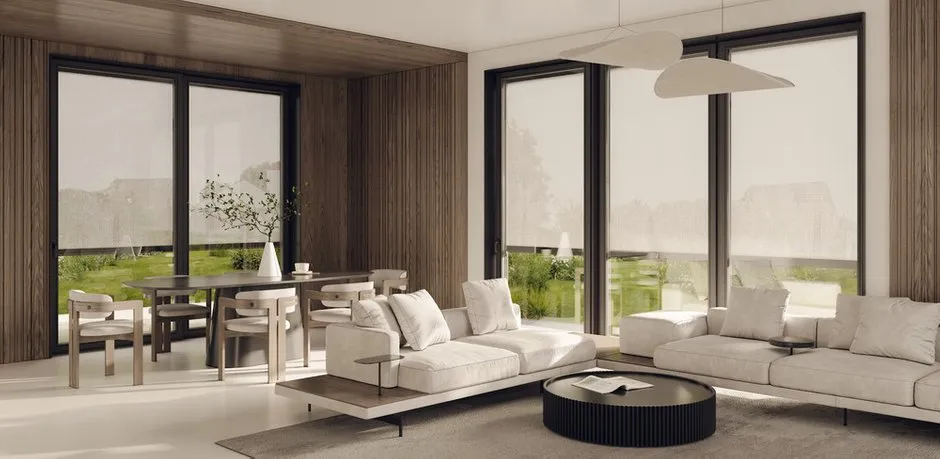 Panoramic Glass wird zu einem wesentlichen Merkmal moderner Ferienhäuser. Es lässt so viel Licht wie möglich herein und erweitert den visuellen Raum, indem es einen Blick auf die Natur eröffnet. Der Verzicht auf schwere Vorhänge und Jalousien ist ebenfalls ein Trend, der an Popularität gewinnt, besonders in Häusern mit Panoramafenstern. Offene Fenster sorgen für mehr Licht und schaffen einen lichteren, luftigeren Raum.