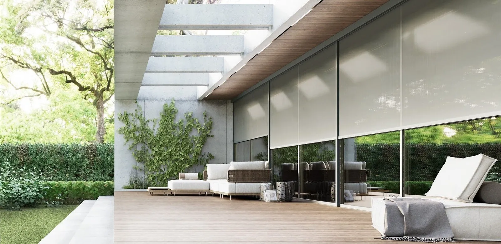 Anstelle von Vorhängen und Jalousien werden heute immer häufiger äußere textile Systeme verwendet, die das Äußere des Hauses nicht beeinträchtigen. Ein Beispiel ist das Unternehmen „ALUTECH“, das eine äußere Sonnenschutzsysteme anbietet. Es handelt sich um ein System aus PVC-Textilien, das den Schutz vor Sonne, Blendlicht, Insekten und Staub bietet. Die dünnen Leitungen und der kompakte Kasten ermöglichen eine minimalistische Fassade.