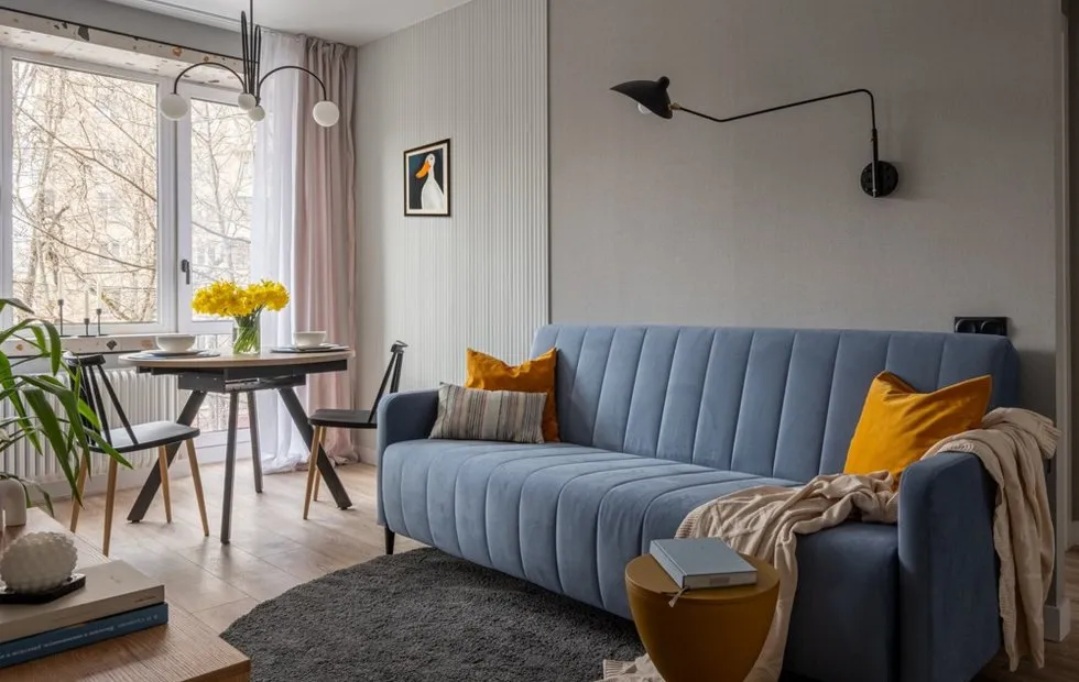 „Wir entschieden uns dafür, die Fokuswand in eine blaue Kontrastfarbe zu bemalen. Mir gefällt dieser Farbton sehr gut. Ich liebe solche unerwarteten, nicht-standardisierten Lösungen“, teilt der Designerin mit. Und diese Entscheidung hat sich gelohnt: „Er hat mir in 5 Jahren nicht langweilig geworden.“