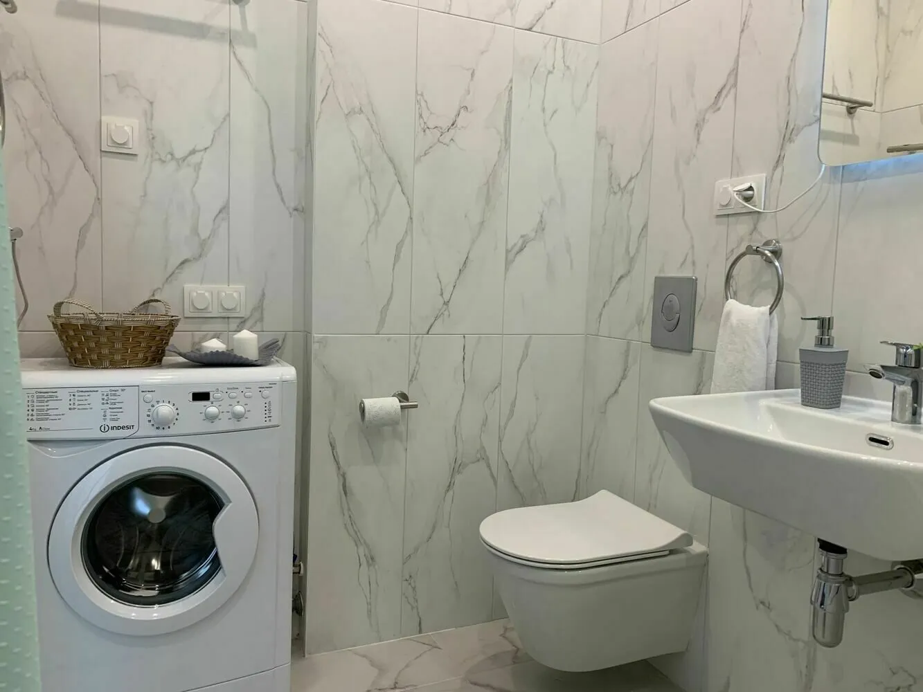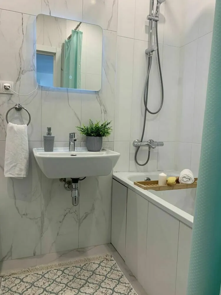 Im Badezimmer hat der Entwickler eine Fliesenbelag für Boden und Wände mit großformatigem Keramogranit ausgeführt. Helle Fliesen sehen schön und ästhetisch aus, sind leicht zu pflegen. Die Sanitär wurde auch vom Entwickler vorbereitet – das ist eine vollwertige Badewanne, WC, Waschbecken. In die kleine Nische passte sich eine Waschmaschine gut ein, über dem Waschbecken wurde ein Spiegel mit Beleuchtung aufgehängt und die Badewanne ergänzt durch eine farbenfrohe Vorhänge.