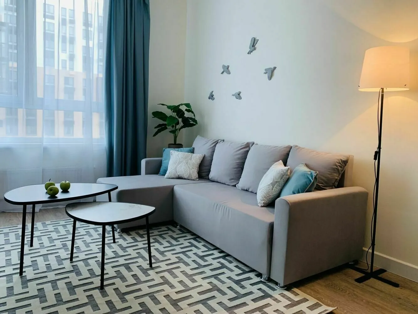 Ein offensichtlicher Vorteil der Planung ist die niedrige Fensterbank und die vergrößerten Fenster. Die Sofazone wurde nahe dem Fenster eingerichtet und optisch hervorgehoben durch einen texturierten Teppich. Ein stilvolles Trenddekor in Form von einfarbigen Silhouetten von Vögeln ist schön und elegant. Die Vögel verleihen dem Interieur einen Effekt von Romantik und Leichtigkeit. Der Ecksofa wurde ergänzt durch funktionalen Tisch für Zeitschriften und eine Laterne, die sanften komfortablen Licht spendet.