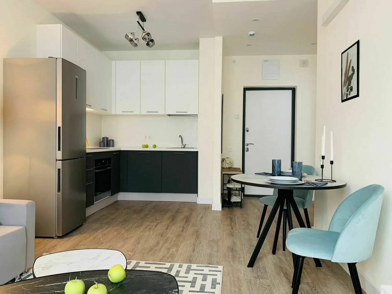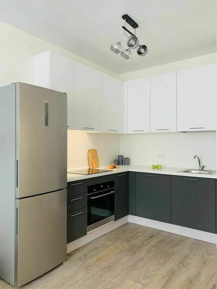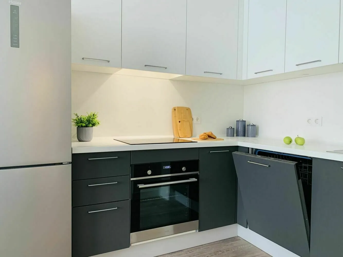 Das zweifarbige Küchenmodul „Standard“ Silberstil war bereits vom Entwickler in der Ecke installiert worden. Auf der Küche sind Linien „Standard“ mit moderner Technik von Produzent Haier ausgestattet: Einzelstehender Kühlschrank, eingebaute Ofentür, Geschirrspüler, Abzugshaube und Kochfeld.