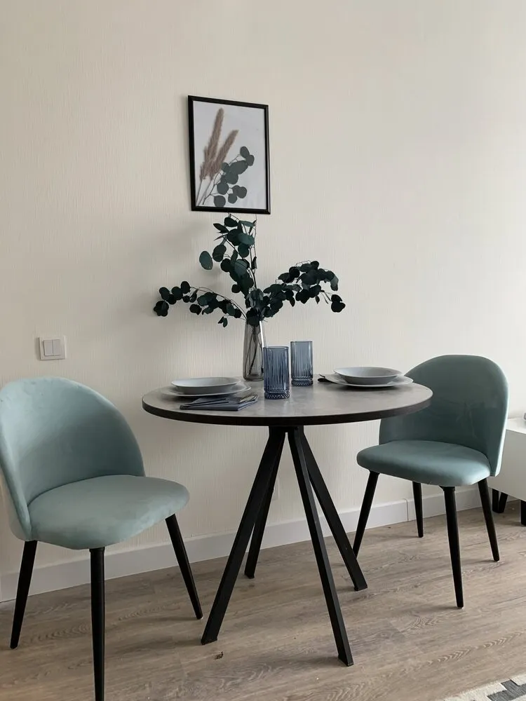Die Esszone wurde elegant, aber sehr praktisch gestaltet. Die graue Arbeitsplatte erinnert an das Küchenmodul, während die dunkle Basis zu den Stuhlbeinen passt. Die weichen Stühle wurden in einem akzentuierten blauen Ton gewählt, der sich hervorhebt, aber gut mit dem Textilien und Dekor kombiniert.