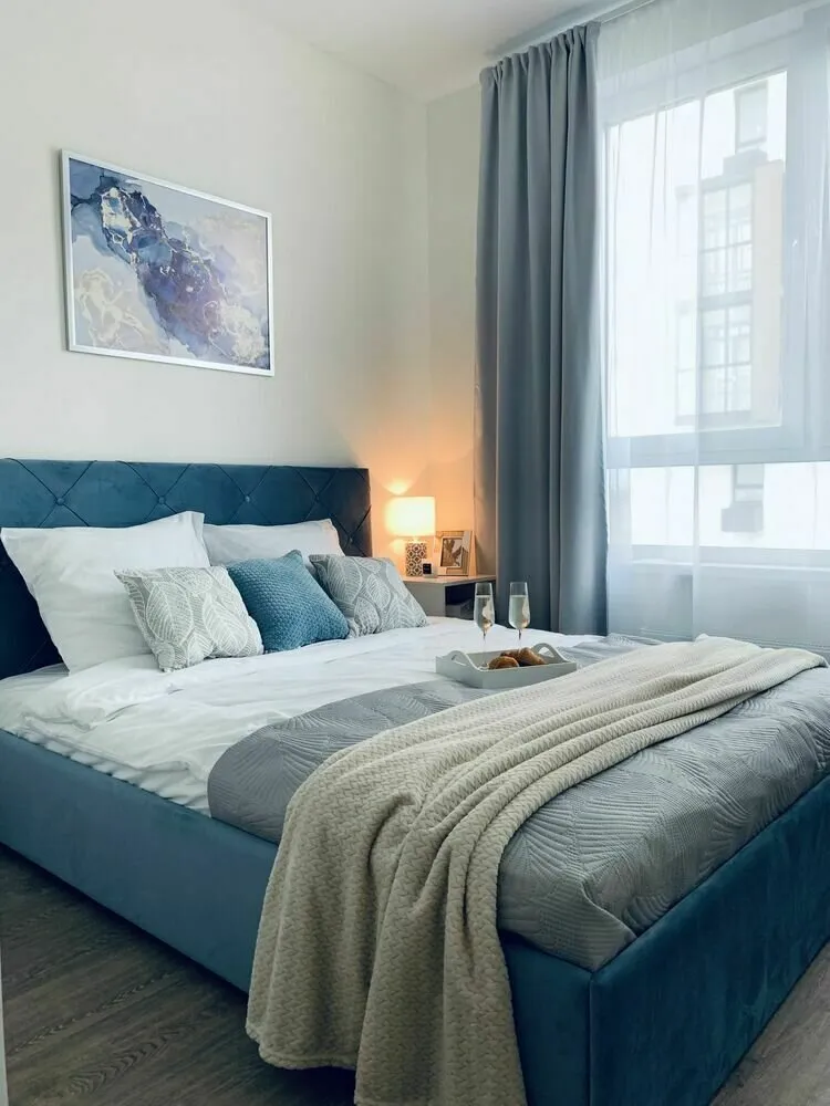 Der zentrale Platz in der Schlafzimmertür belegt das Bett mit einem effektvollen weichen Kopfteil. Die sanfte blaue Polsterung verleiht dem fast monochromen Interieur Ausdruck. Der akzentuierte Ton wurde durch ein Bild im Kopfteil und einen weichen Puff aufrechterhalten. Dekorativ Kissen und texturierte Decken verleihen dem Zimmer Volumen.