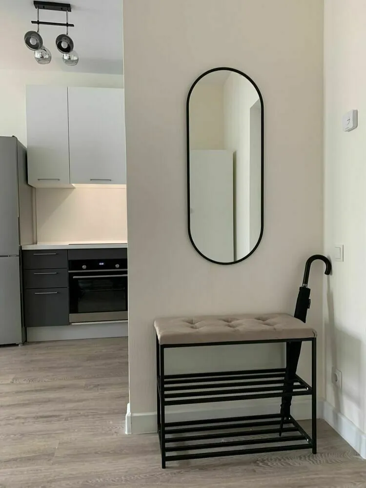 In der Eingangshalle ist ein weißer Doppeltüren Kommode mit geschlossenen Fronten, ein oval gespiegeltes Spiegel in einer grafischen schwarzen Rahmen, eine weiche Schuhbank.
