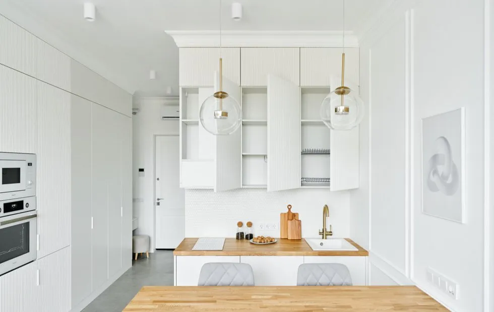 Eine Wand in der Küche wurde mit Backstein verkleidet und mit weißer Farbe überzogen. Sie wirkt effektvoll, korrigiert optisch die Raumgeometrie und hebt niedrige Decken auf.
