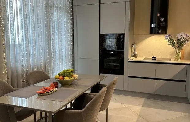 Da Lyubov selten kocht, wählte sie eine zweifach konfigurierbare Herdplatte und fügte eine Multicooker hinzu. Hier befindet sich auch eine Spülmaschine, ein Ofen und ein schwarzer Kühlschrank. Eine nicht eingebaute Mikrowelle bekam eine eigene Regal-Ebene.