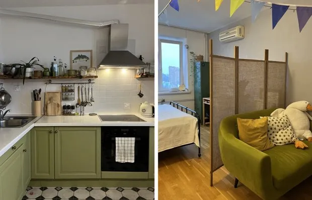 Jedem Raum verlieh Nasta einen einzigartigen Charakter durch Farben: Für den Flur wählte sie einen intensiven grünen Ton „Tanne“, für das Kinderzimmer gelb, fröhlich und energiegeladen. Dieser Ansatz hilft visuell Räume zu trennen, selbst wenn die Grundrisse offen sind.