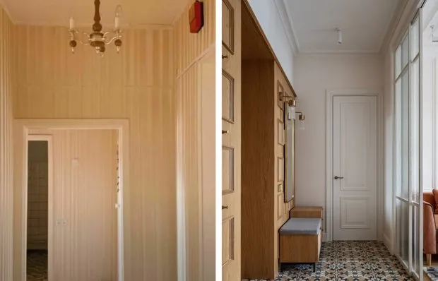 Vor und nach: Wie schön wurde die leere Eingangshalle in der Stalin-Appartement 56 m² umgewandelt
