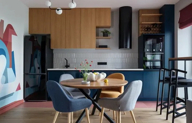 „Nach dem Plan war dies der Ort für Frühstücke, aber im Prozess wurde es praktisch als zusätzliche Arbeitszone genutzt“, bemerkt die Designerin. - Kluges Arbeitsplatten: Die Arbeitsplatte aus Laminat deckt nicht nur die Arbeitszone ab – sie umschließt auch die Seiten der Schränke, was einen zusammenhängenden eleganten Eindruck erzeugt. Ein einfacher Trick, der den Budget nicht erhöht, aber das Wahrnehmungsbild drastisch verändert.