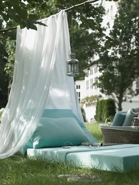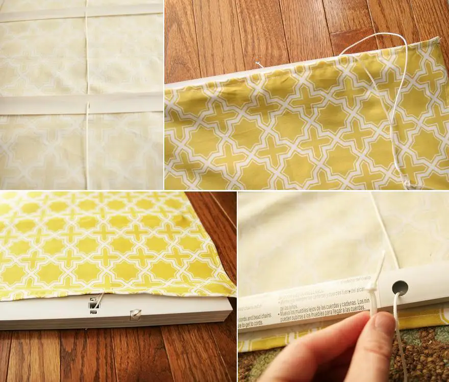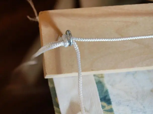 Schritt 7: Befestigen Sie die Vorhänge mit Klettband am Holzstock. Befestigen Sie am Fensterrahmen die Kordelbefestigung. Wickeln Sie nun die Kordel um das Teil, um die Vorhänge zu fixieren. Führen Sie die Kordel durch die Ringe, beginnend an der unteren Kante. Knoten Sie an der unteren Ring die Kordel und sichern Sie ihn mit Kleber.