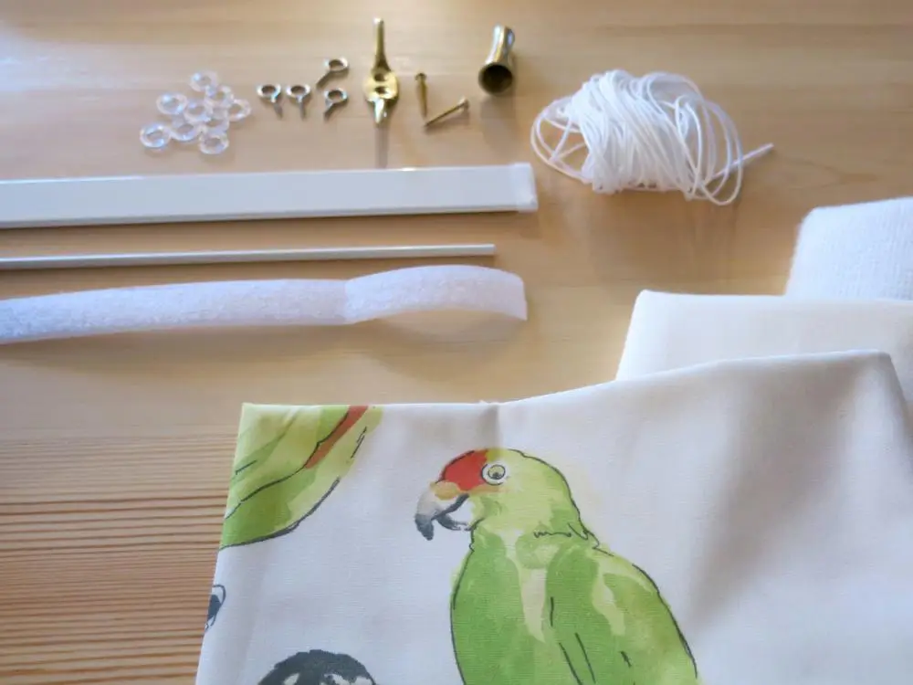 Stoff und Unterlage für die Vorhänge. Metall- oder Holzstangen (je 3 cm kürzer als die Breite der Vorhänge), 7–8 Stück. Klettband (in Breite der Vorhänge). Bohrmaschine und Schrauben. Kreide oder Seife zum Markieren. Faden und Nadel. Nähmaschine. Drei Stücke Kordel, jeweils doppelt so lang wie die Vorhänge, mit einer Breite, die mindestens der Länge einer Vorhanghälfte entspricht. Kunststoffringe. Gewichtsleiste und Holzleiste zum Aufhängen der Vorhänge. Nagel und Haken.