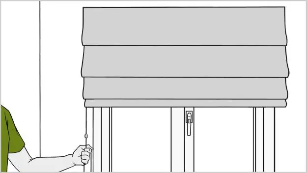 Schritt 9: Befestigen Sie den Holzstock an der Fensteröffnung mit Bohrmaschine und Schrauben. Entfernen Sie danach die Bänder, die die Falten fixiert hatten. Wenn die Vorhänge heruntergelassen sind, müssen Sie die Spannung aller Kordeln ausgleichen. Halten Sie sie zusammen, bis Sie einen Knoten binden, der anschließend hinter dem letzten Ring versteckt wird.