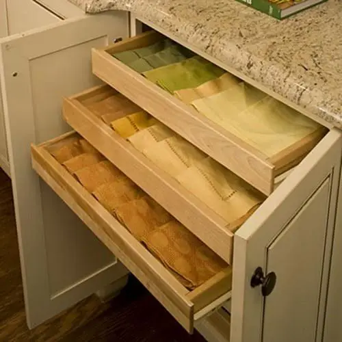 5. Wenn Sie Glück haben und auf der Küche noch Platz ist, versuchen Sie, etwas Platz in Schubladen für die Aufbewahrung von Textilien freizuhalten. Sauber, ansprechend und immer griffbereit!