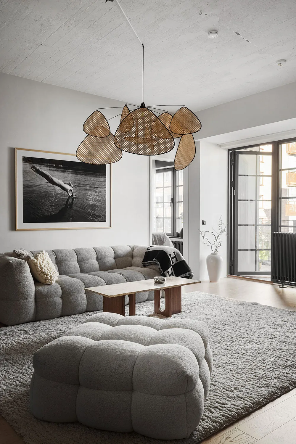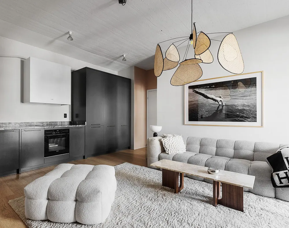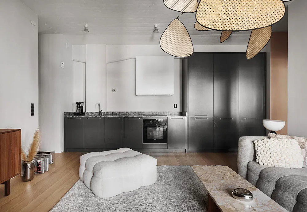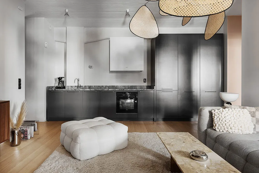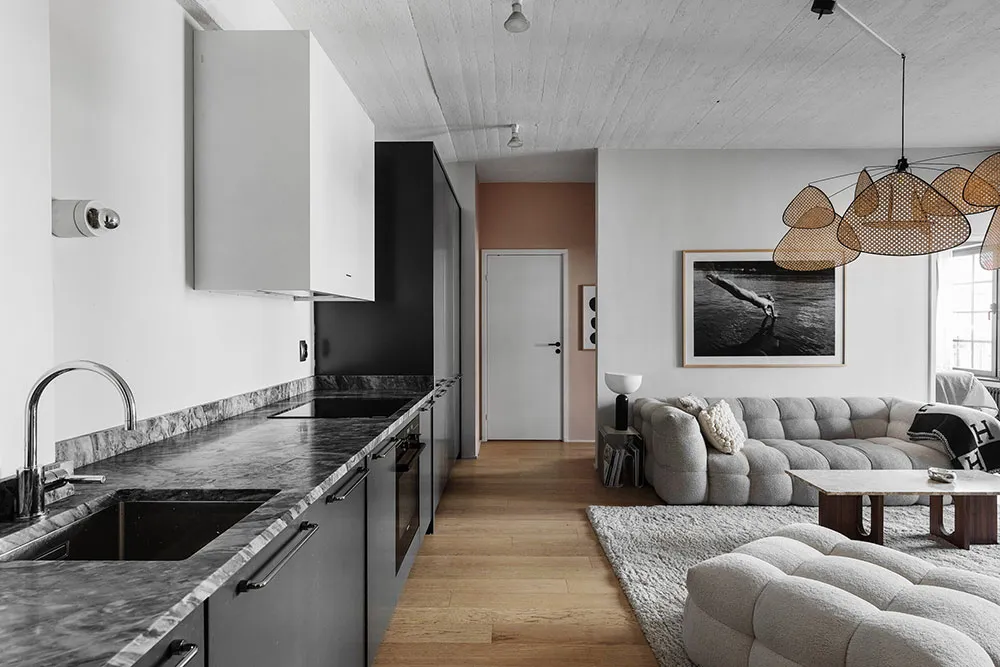 Das Interior dieser 57 qm großen Wohnung in Stockholm ist fast monochromatisch, doch der industrielle Charakter des Raums spürt man in allen Räumen.