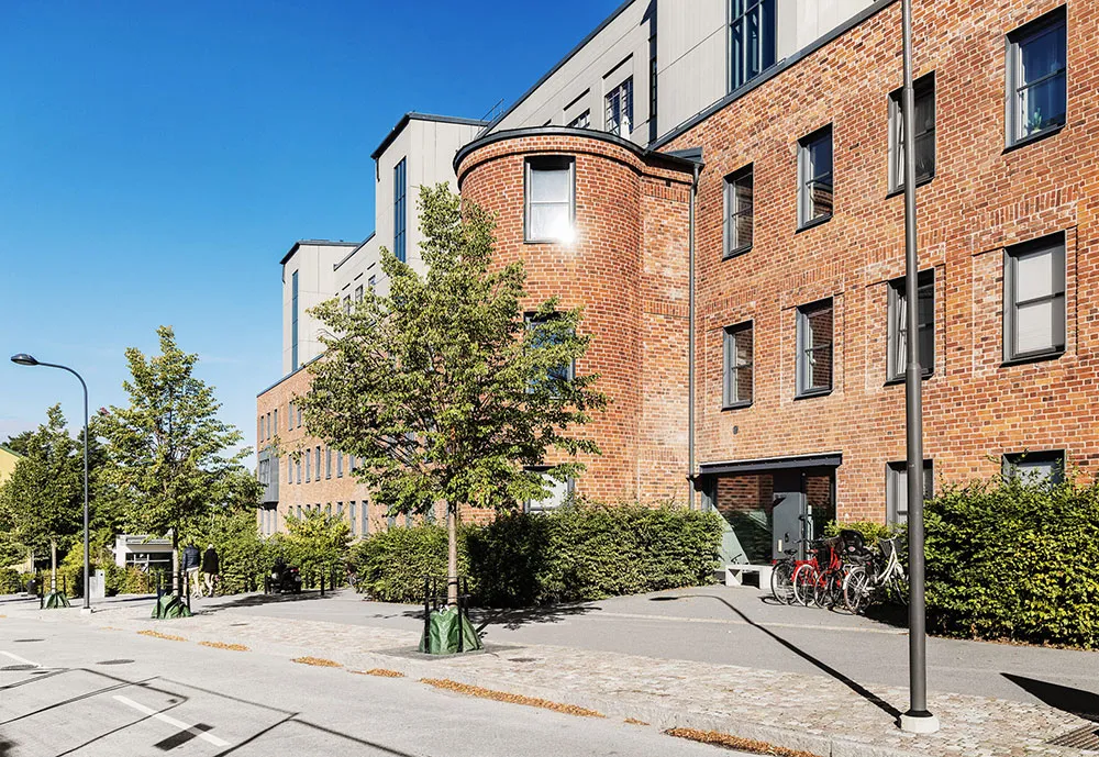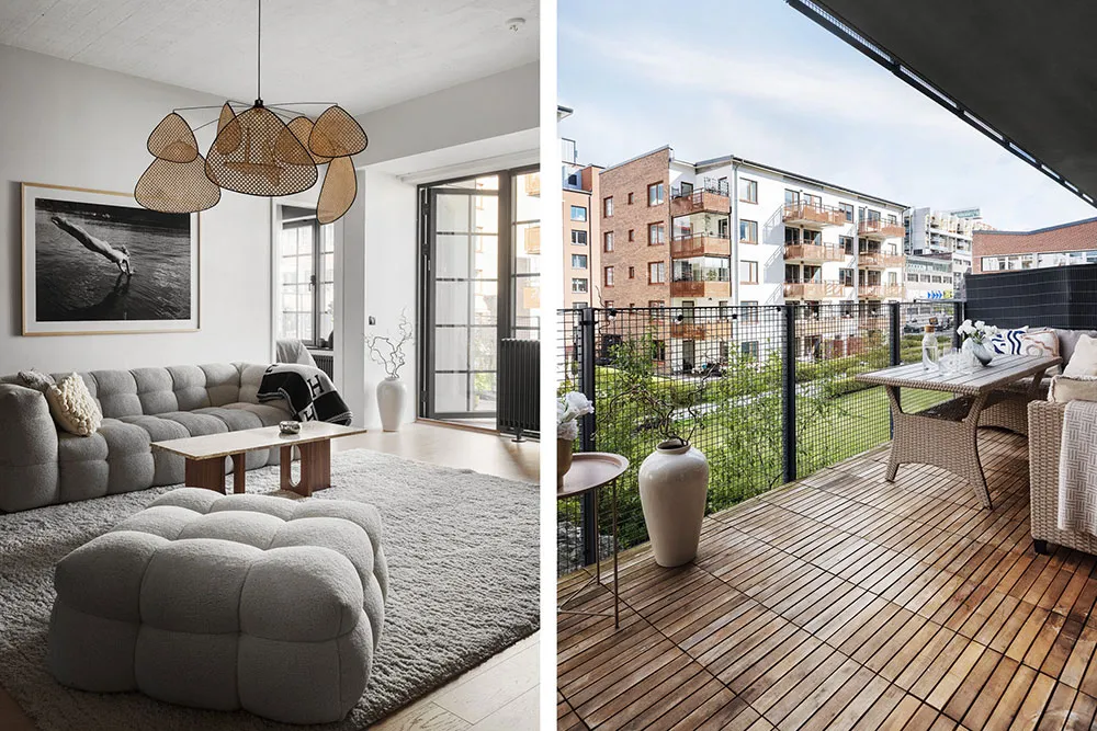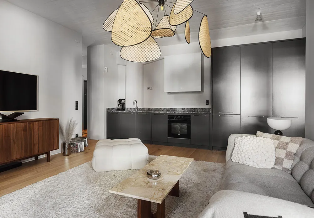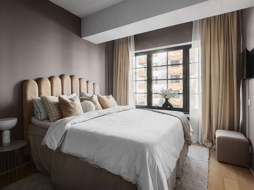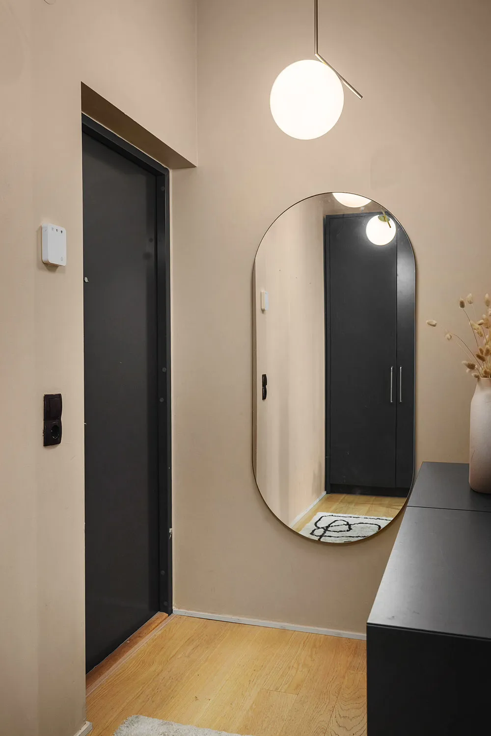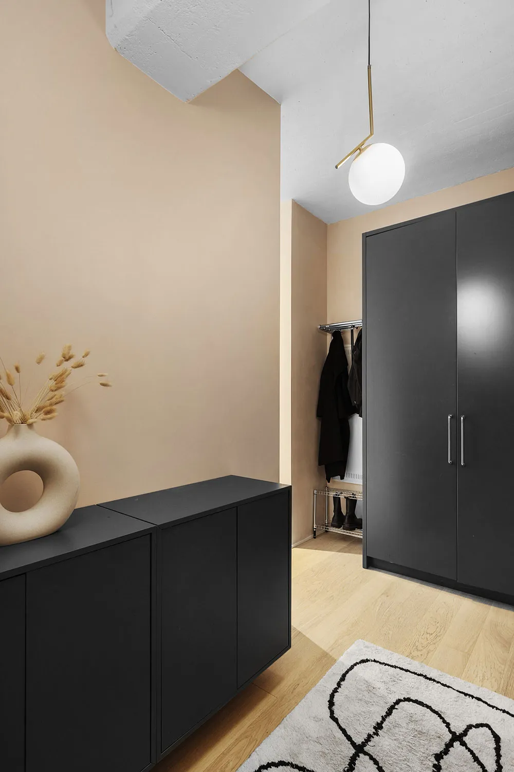 Stylischer grauer Interior mit warmen Akzenten in einem ehemaligen Schulgebäude in Stockholm (57 qm)