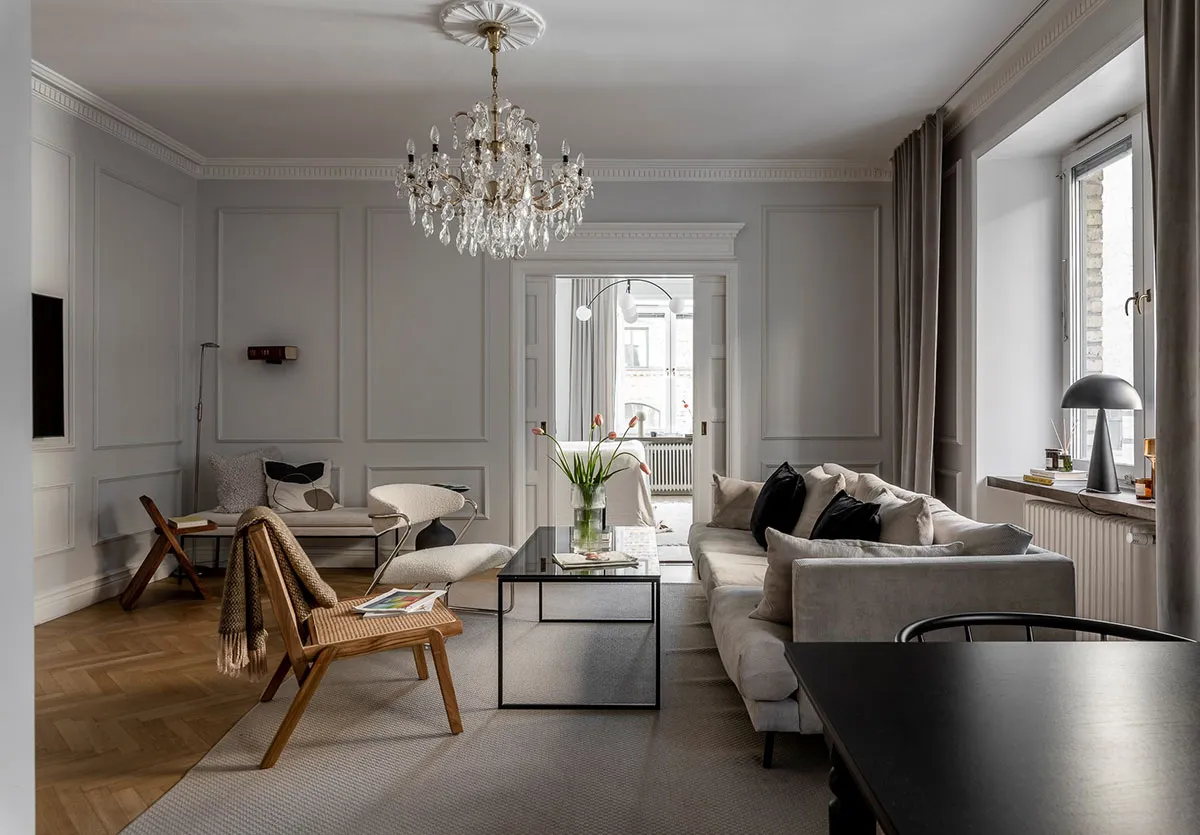 Diese Wohnung in Stockholm ist im weichen, eleganten Stil eingerichtet, was durch ihre maßvolle und ruhige Atmosphäre charakterisiert ist.