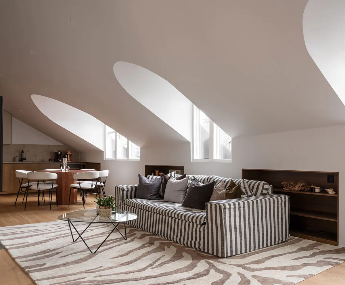 Stylische Dachwohnung mit gestreiftem Sofa