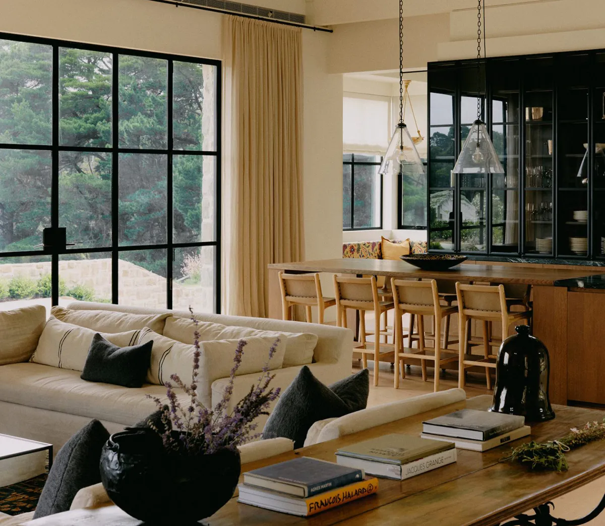 Ruhiger skandinavischer Interior mit Blick auf den Hafen