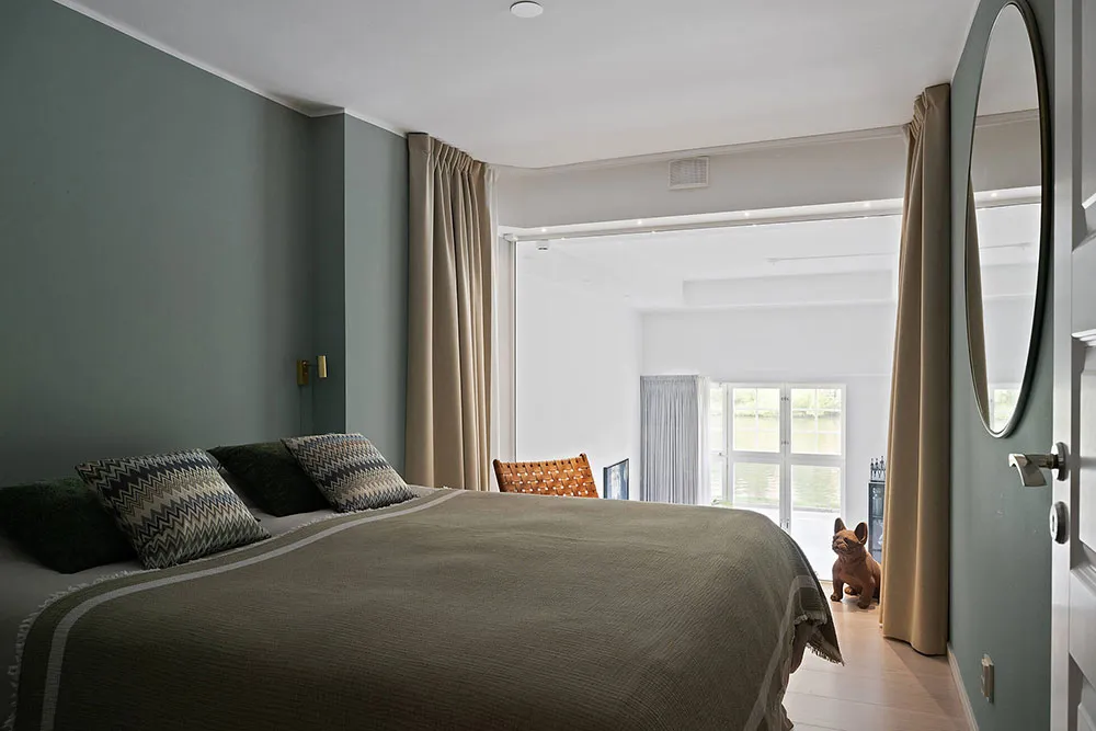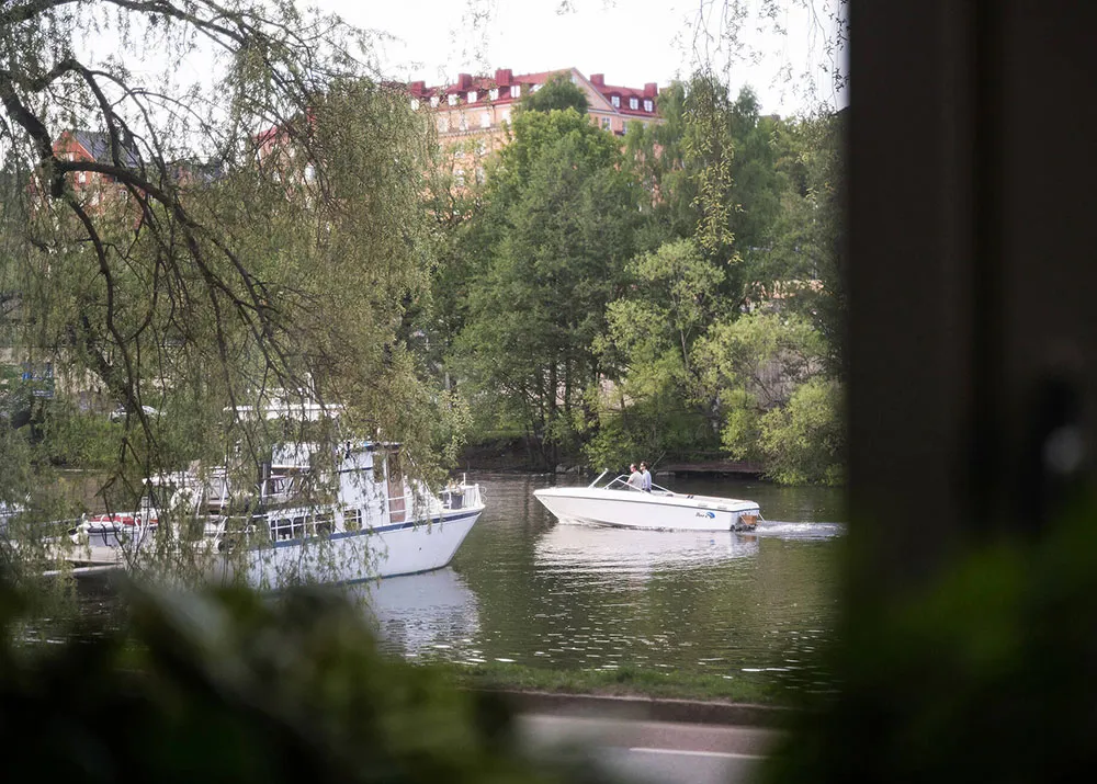 Ruhiger skandinavischer Interior mit Blick auf den Hafen