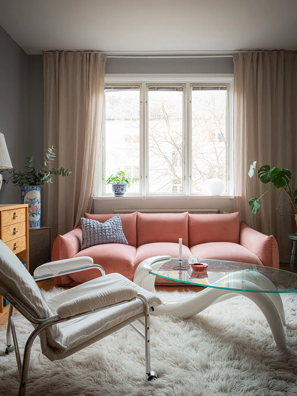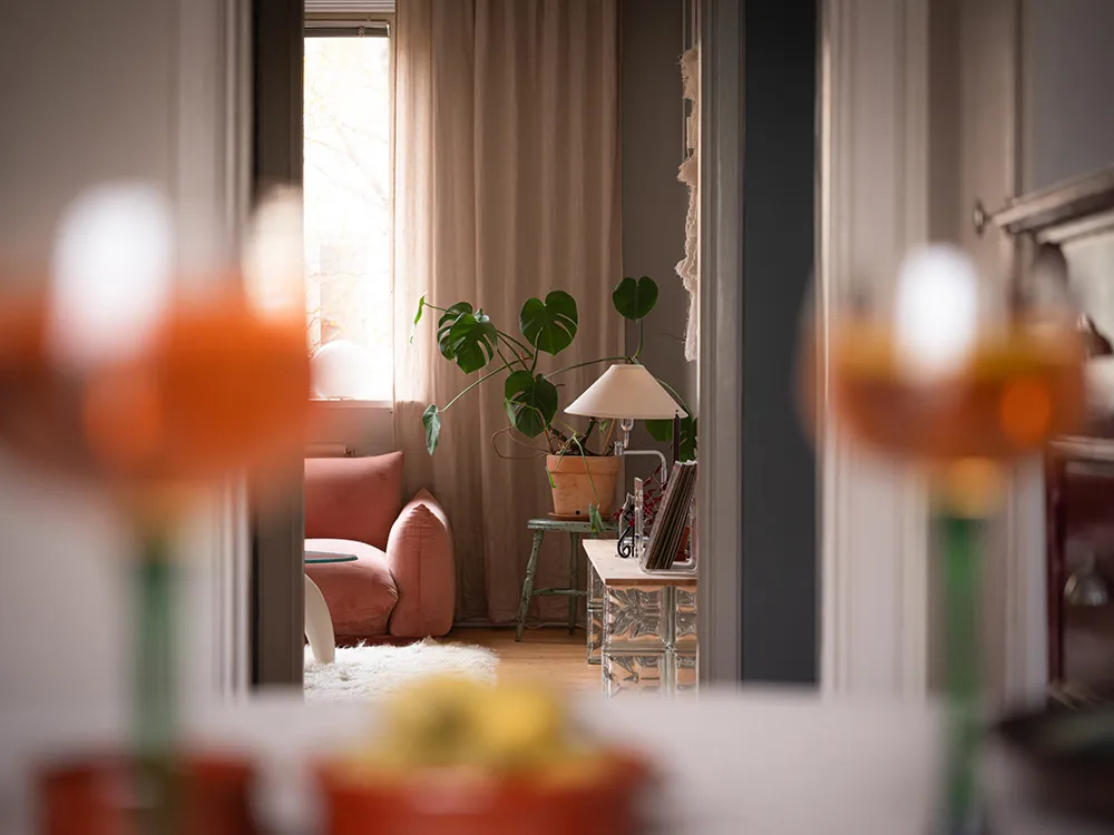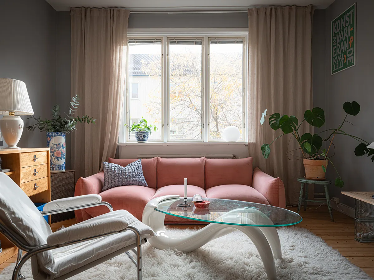 Pink Sofa und Retro-Noten: Interessanter Design einer kleinen Wohnung in Schweden (48 qm)