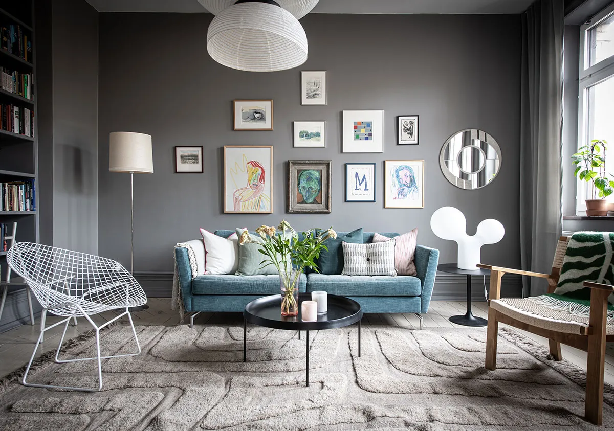 Schwedische Wohnung mit atmosphärischer Wohnzimmer und hellem Küchenraum mit Holzverzierungen