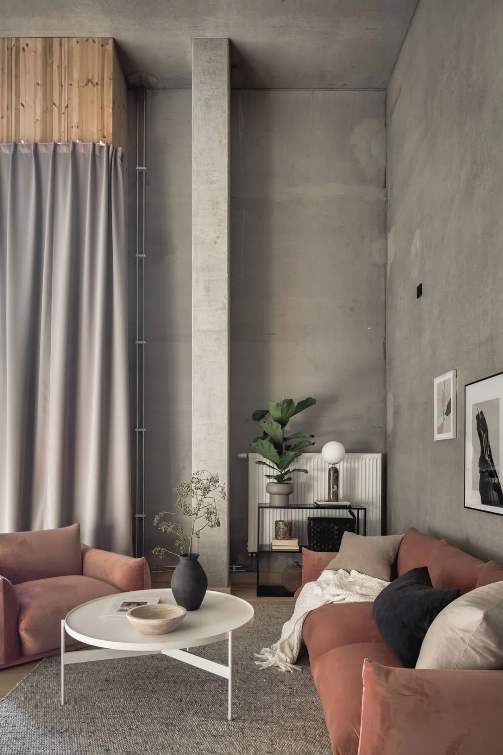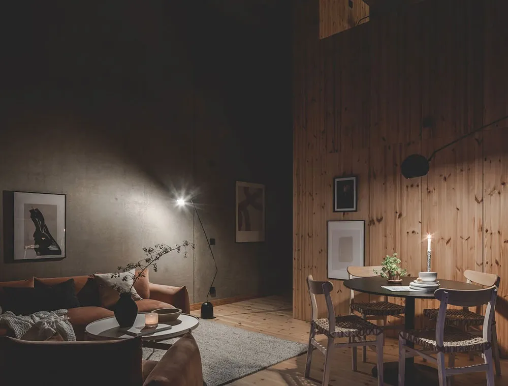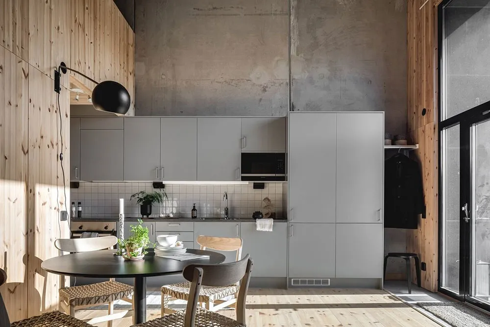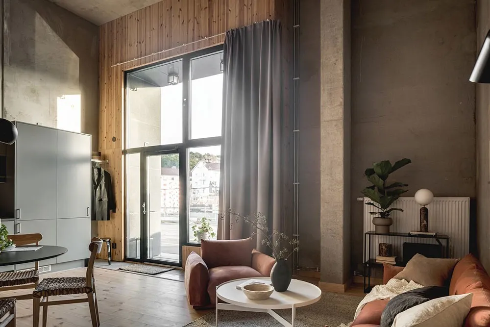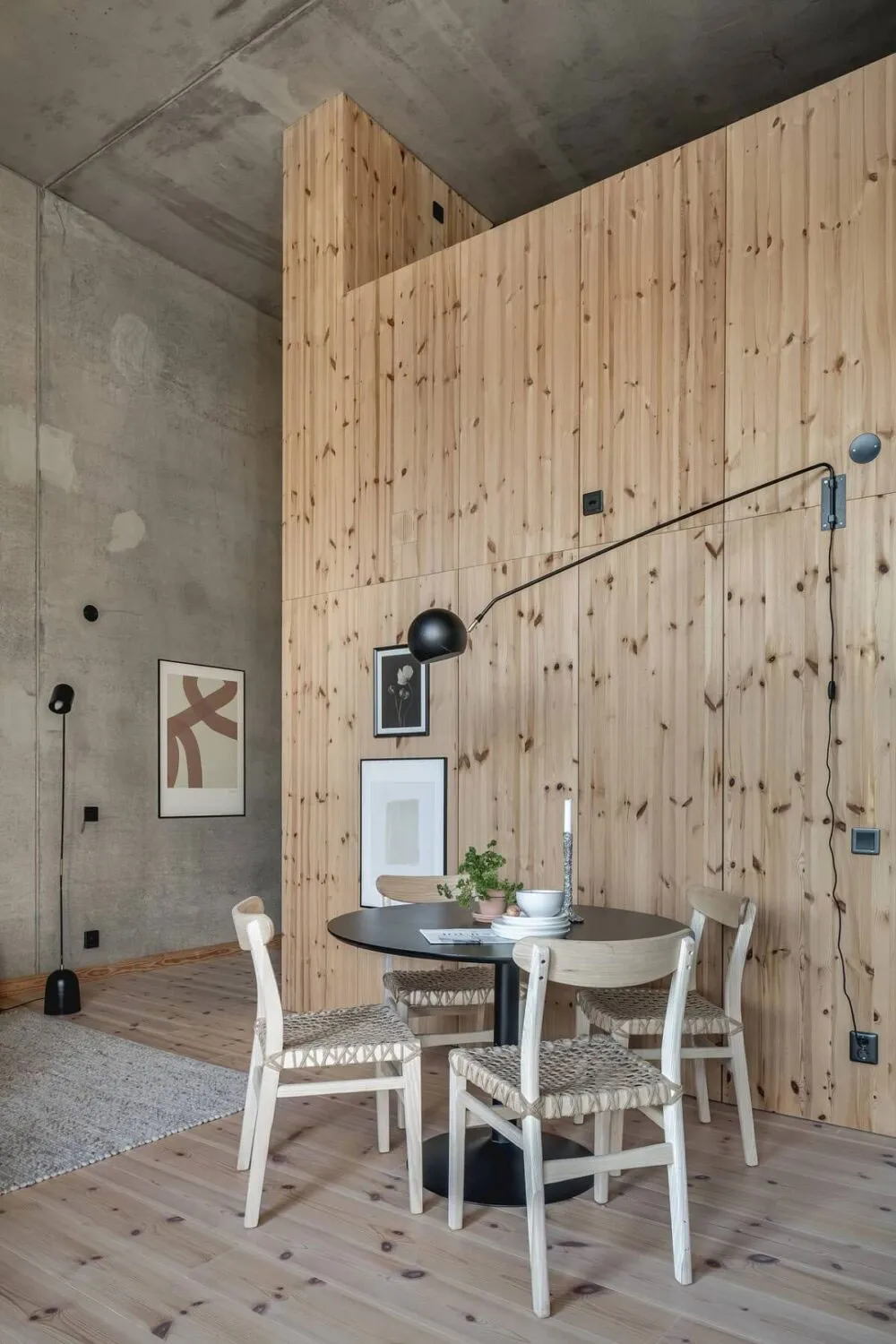 Kalter unbehanderter Beton und warmes Holz sind eine gewinnende Kombination für das Interieur dieser Wohnung in Göteborg.