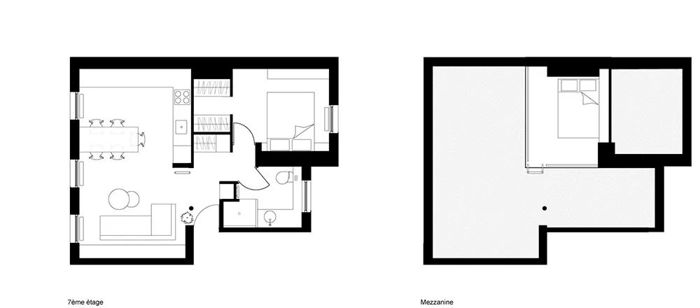 Diese kleine Wohnung in Paris befindet sich im Dachgeschoss eines alten Hauses, doch ihr Interieur ist modern und minimalistisch.