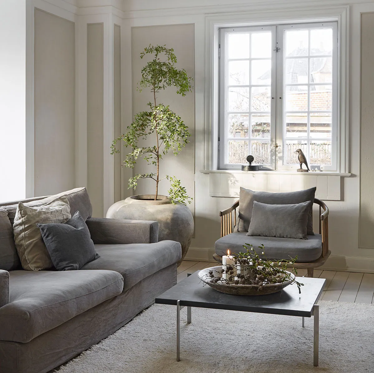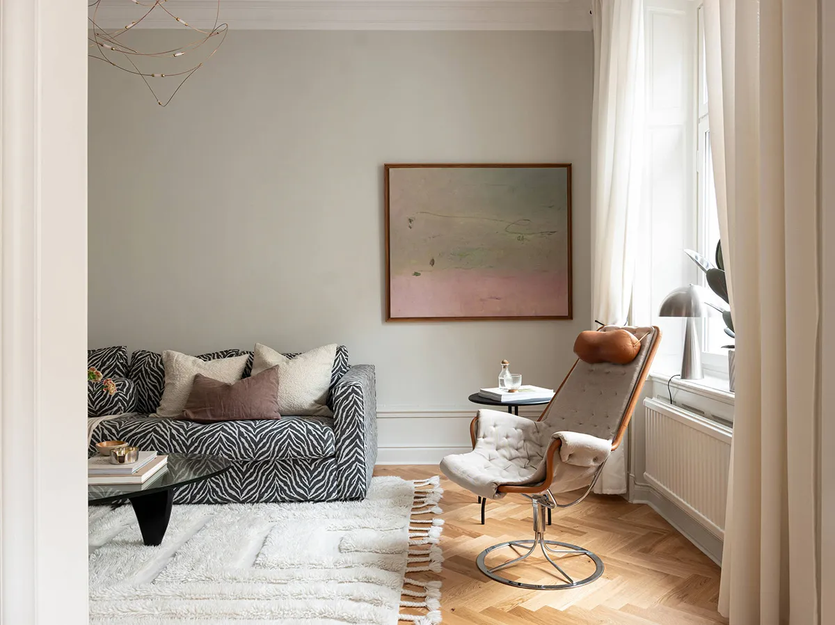 Eleganter skandinavischer Interieur mit mutigem Sofa und stilvollem Dekor