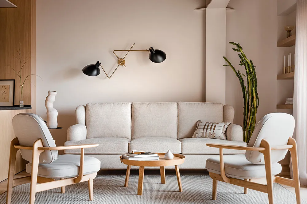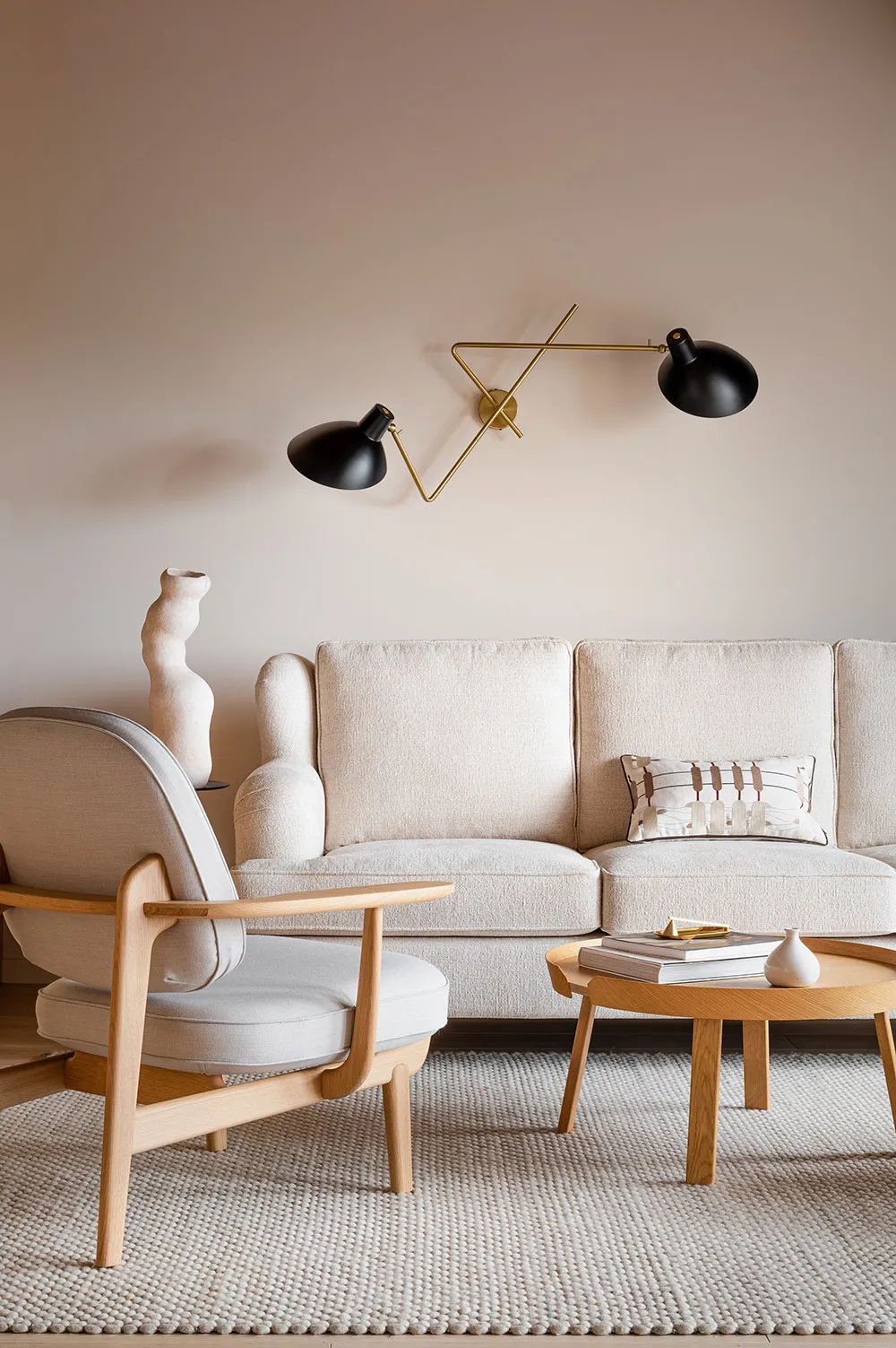 Eleganter skandinavischer Interieur mit mutigem Sofa und stilvollem Dekor