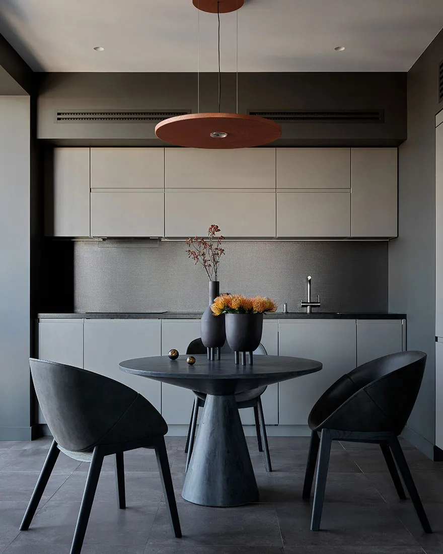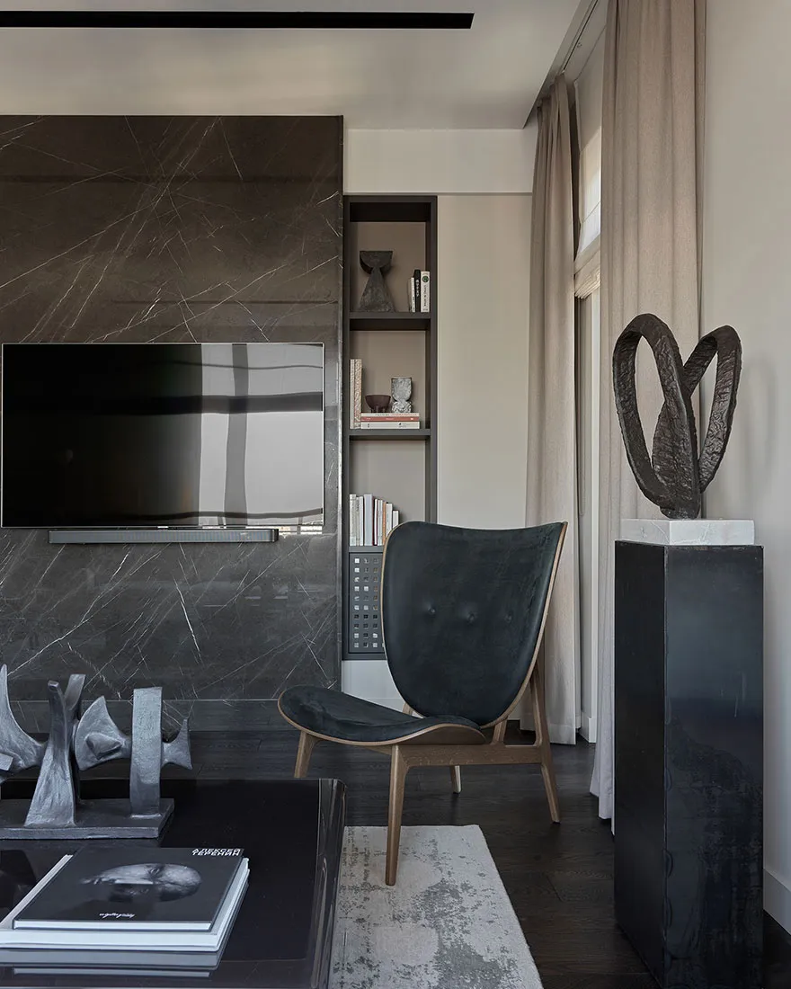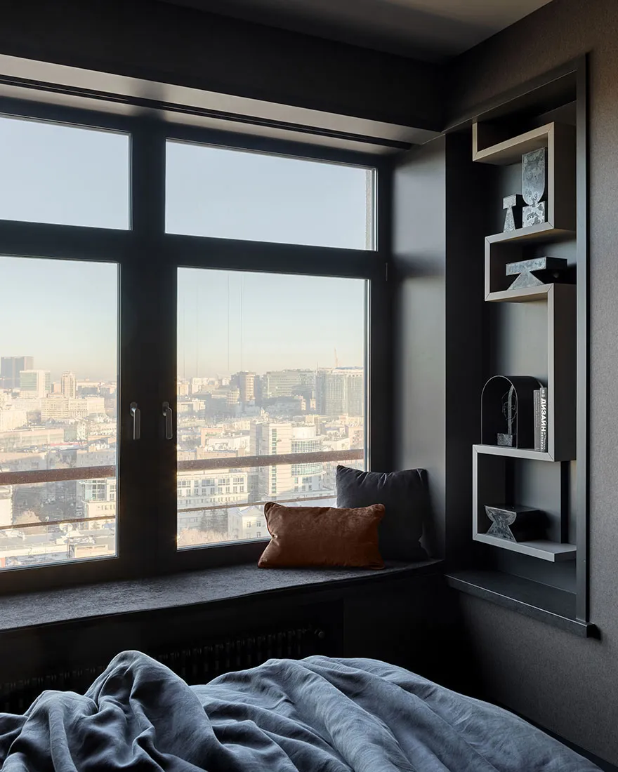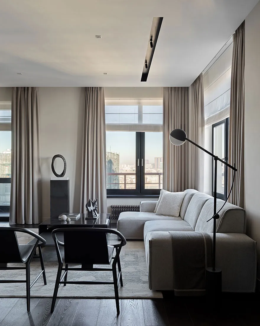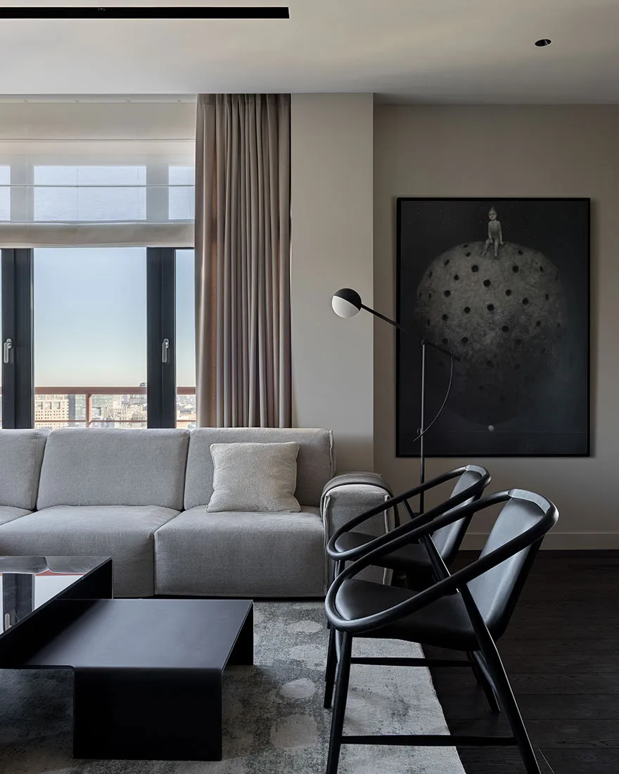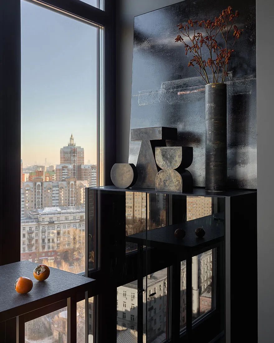 Das Vorhandensein eines großen Anteils dunkler Akzente und strenger Formen war einer der Hauptwünsche des Eigentümers dieser Wohnung in Moskau – eines jungen Unternehmers und Reisenden.