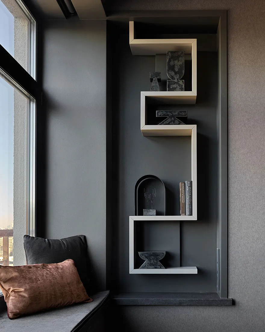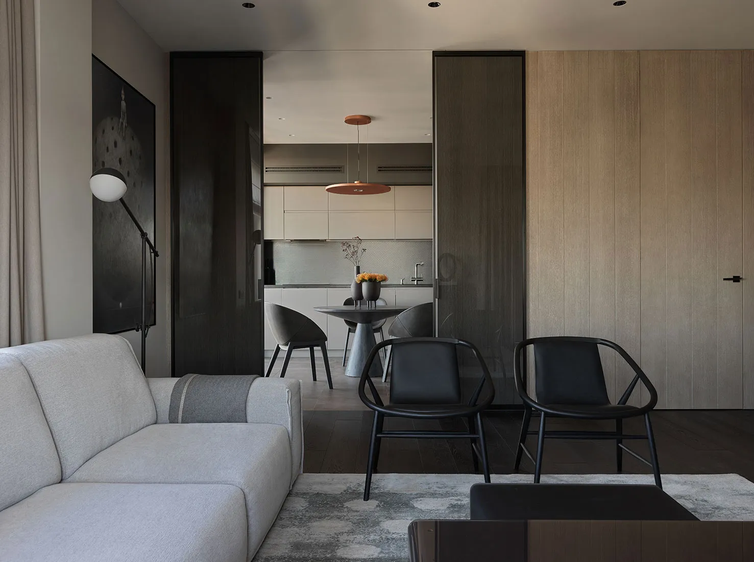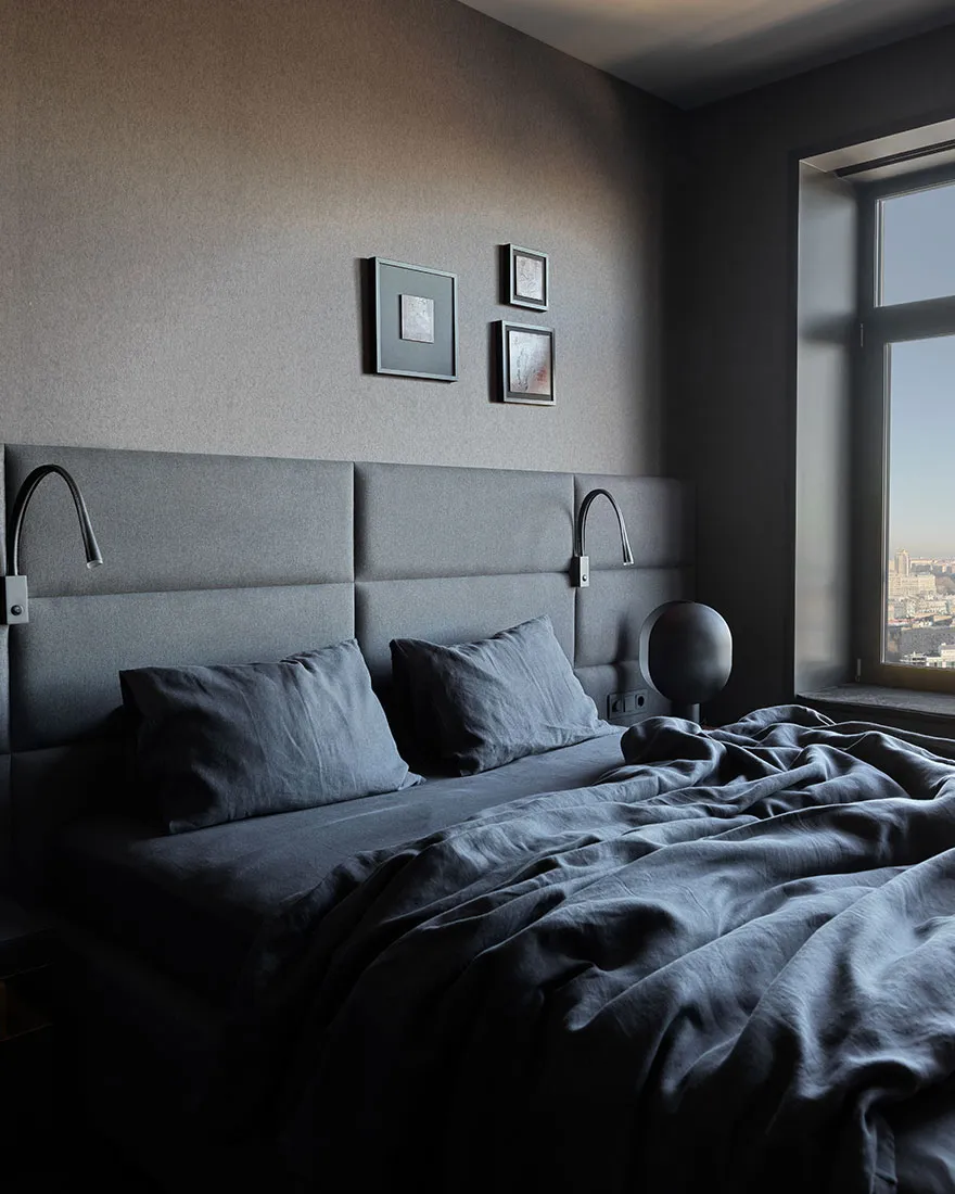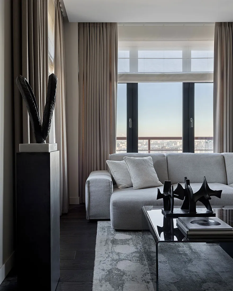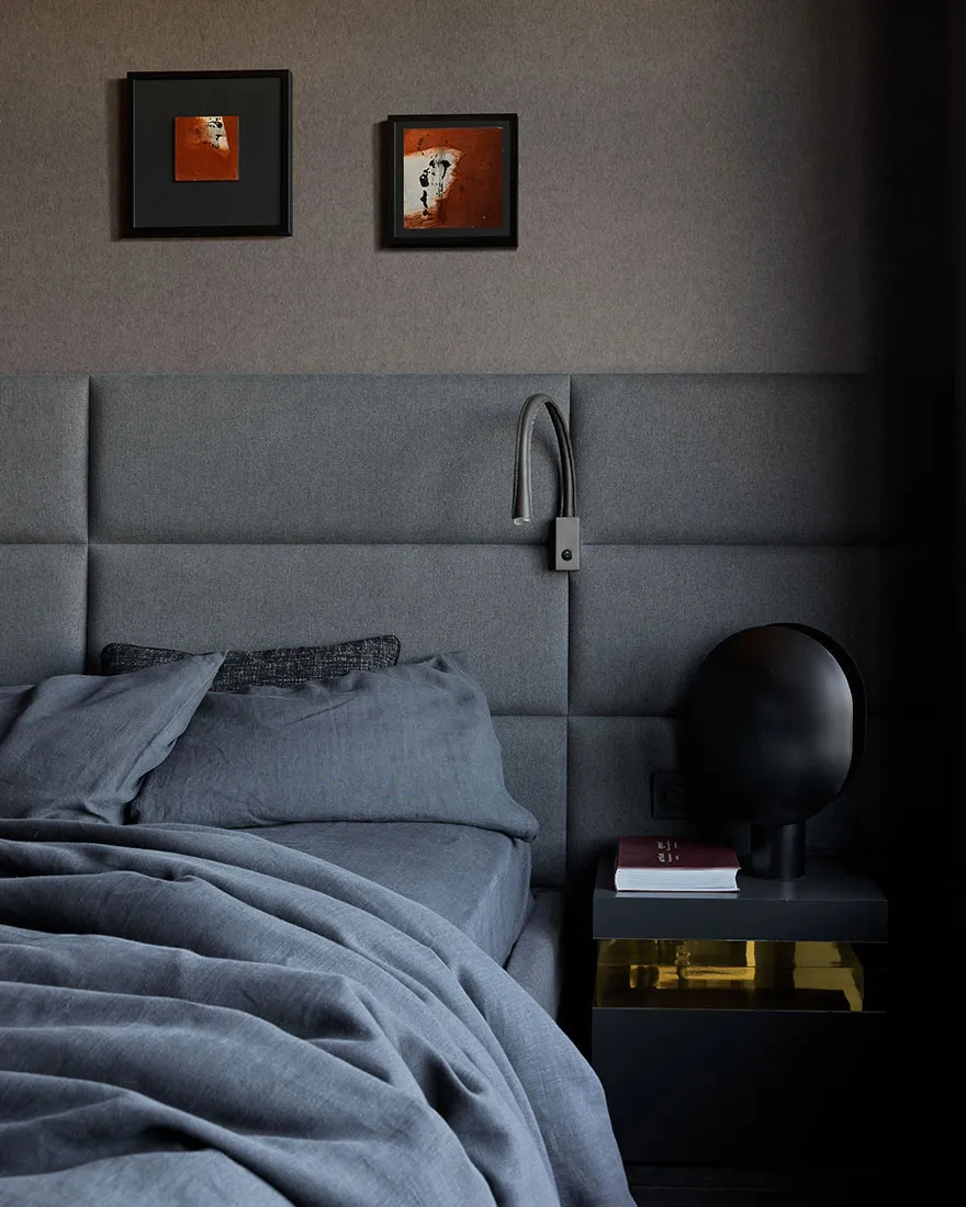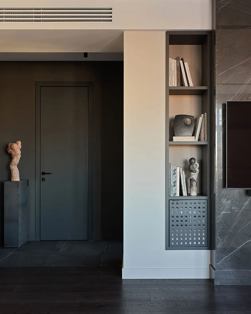 Das Vorhandensein eines großen Anteils dunkler Akzente und strenger Formen war einer der Hauptwünsche des Eigentümers dieser Wohnung in Moskau – eines jungen Unternehmers und Reisenden.