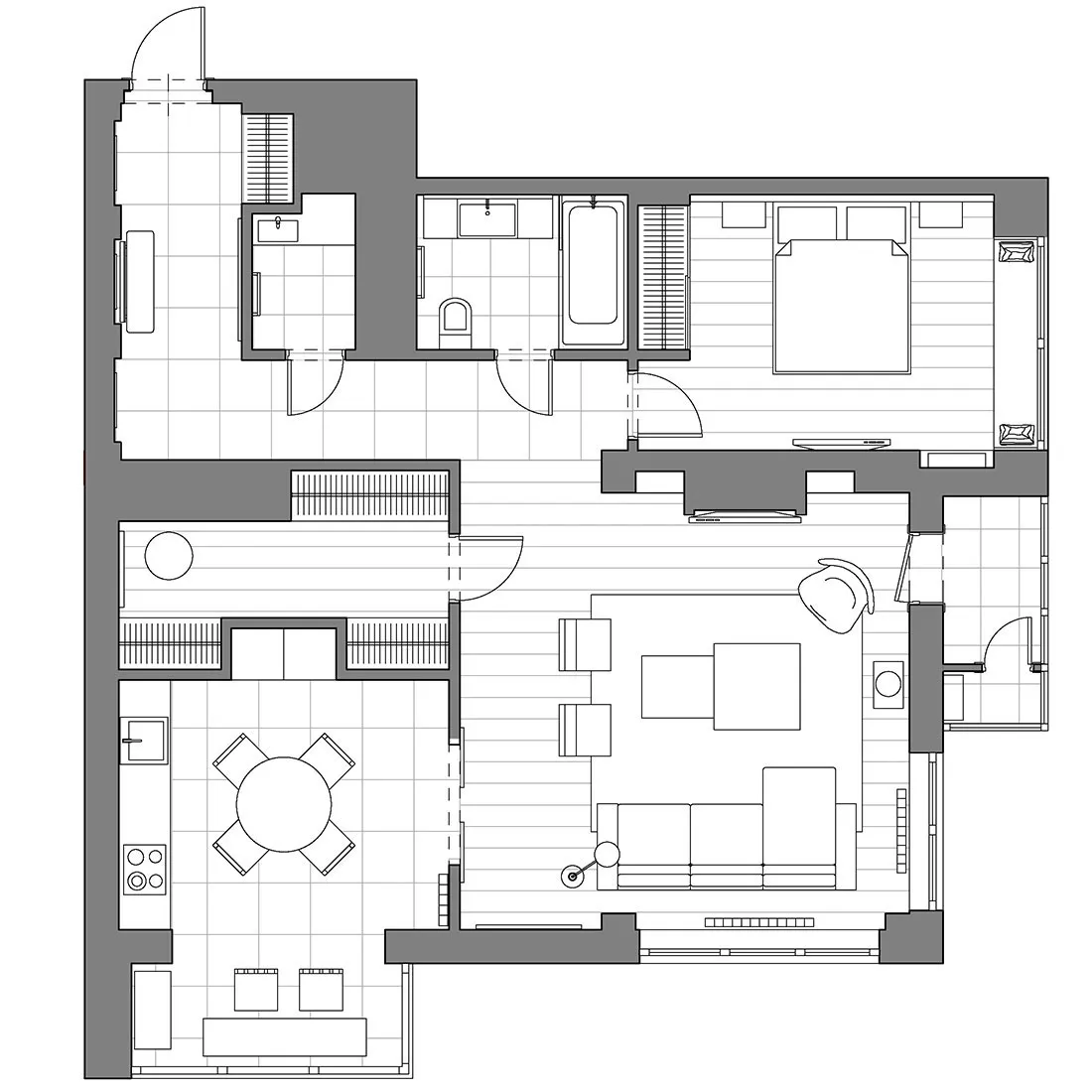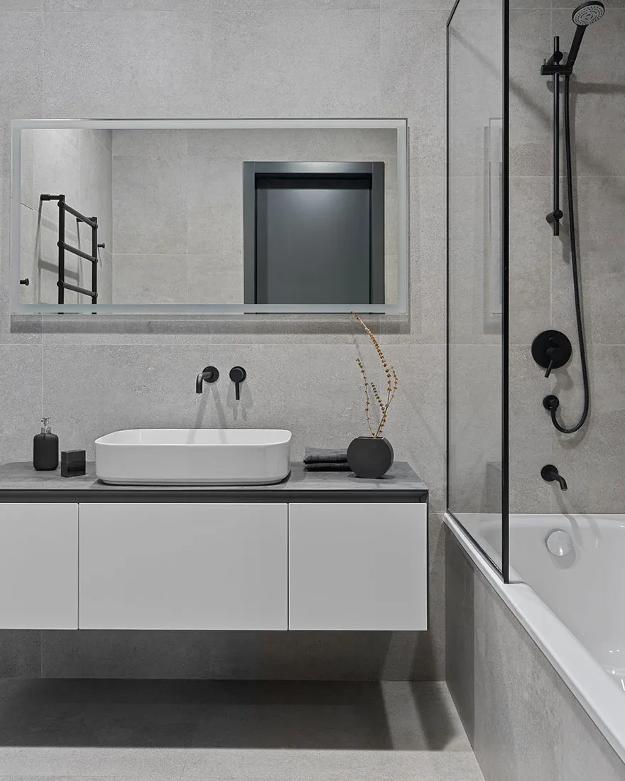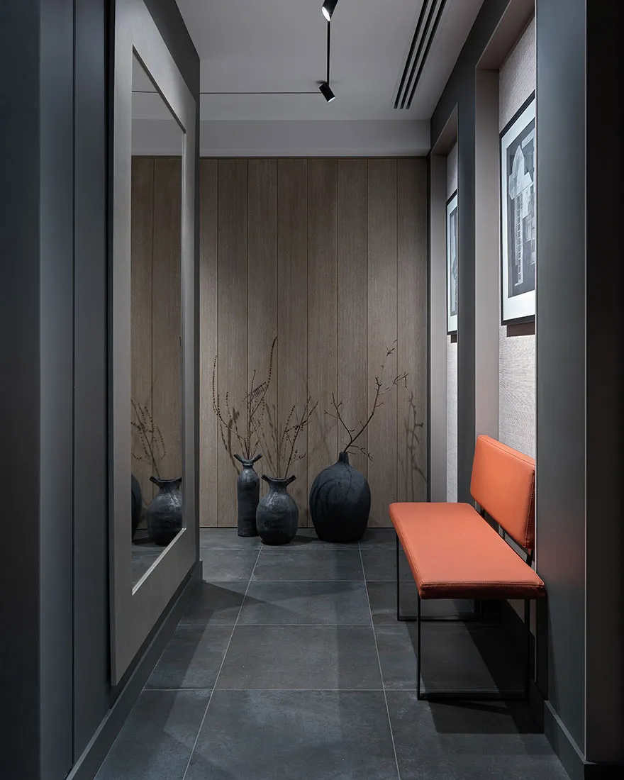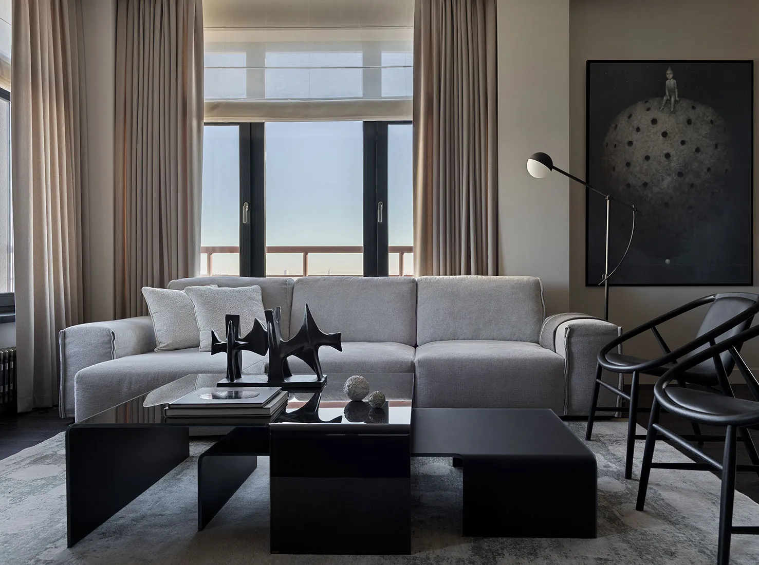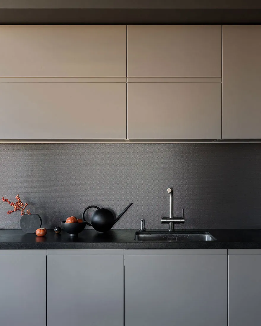 Das Vorhandensein eines großen Anteils dunkler Akzente und strenger Formen war einer der Hauptwünsche des Eigentümers dieser Wohnung in Moskau – eines jungen Unternehmers und Reisenden.