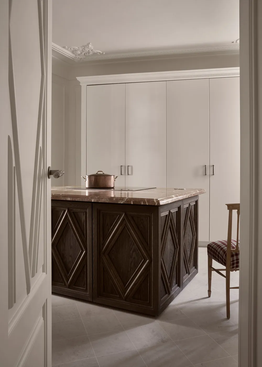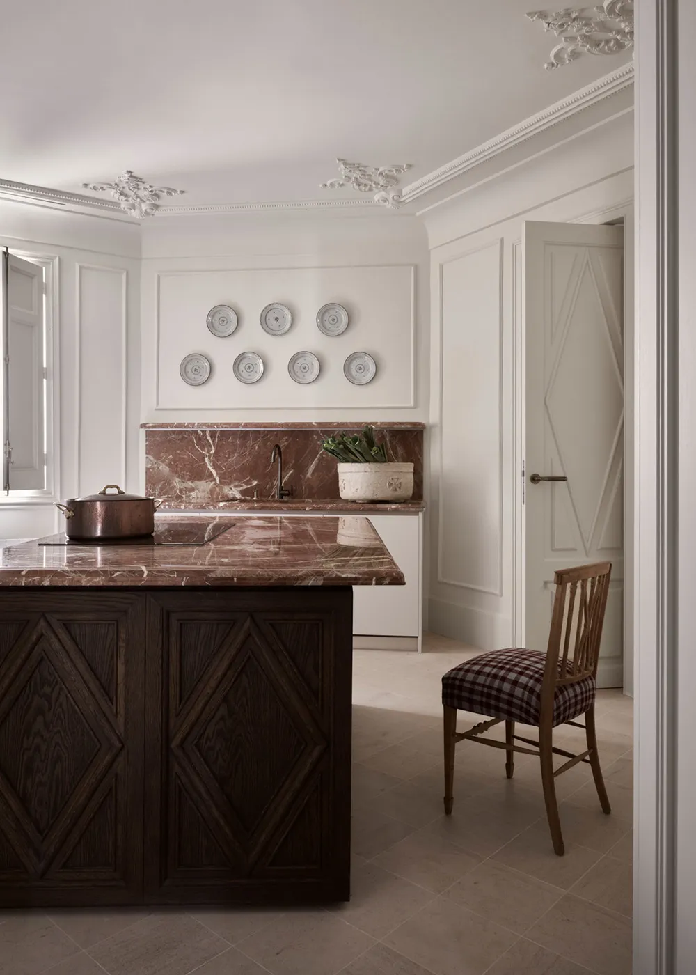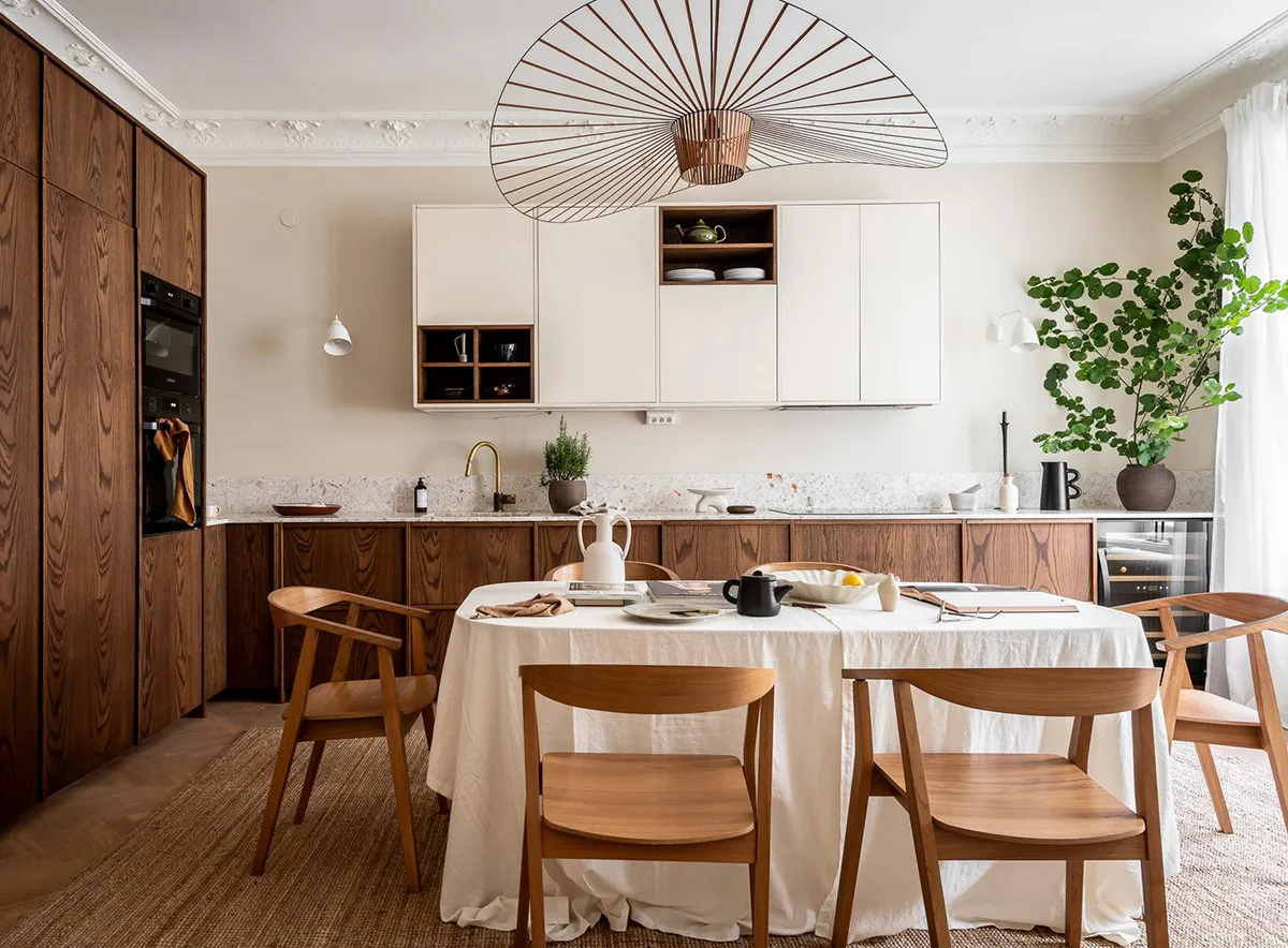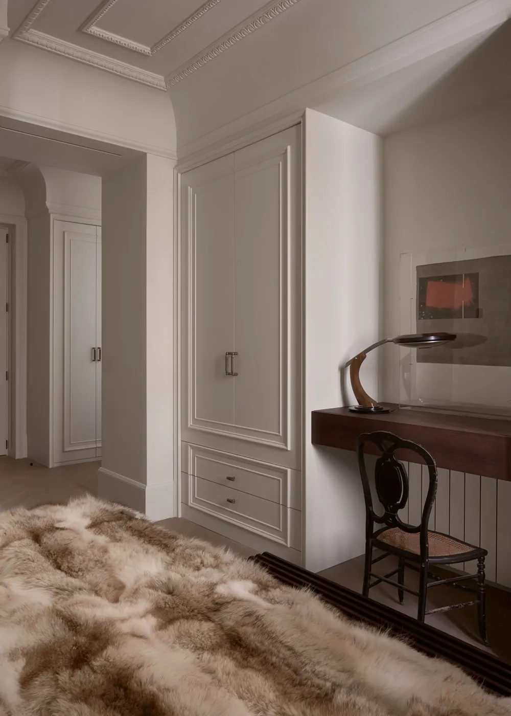 Trotz der ganzen Verfeinerung des Wand- und Deckeninterieurs ist die Farbpalette dieser Wohnung in einem alten Haus im Zentrum von Madrid ziemlich zurückhaltend und sogar neutral, völlig ohne aufdringliche Akzente.