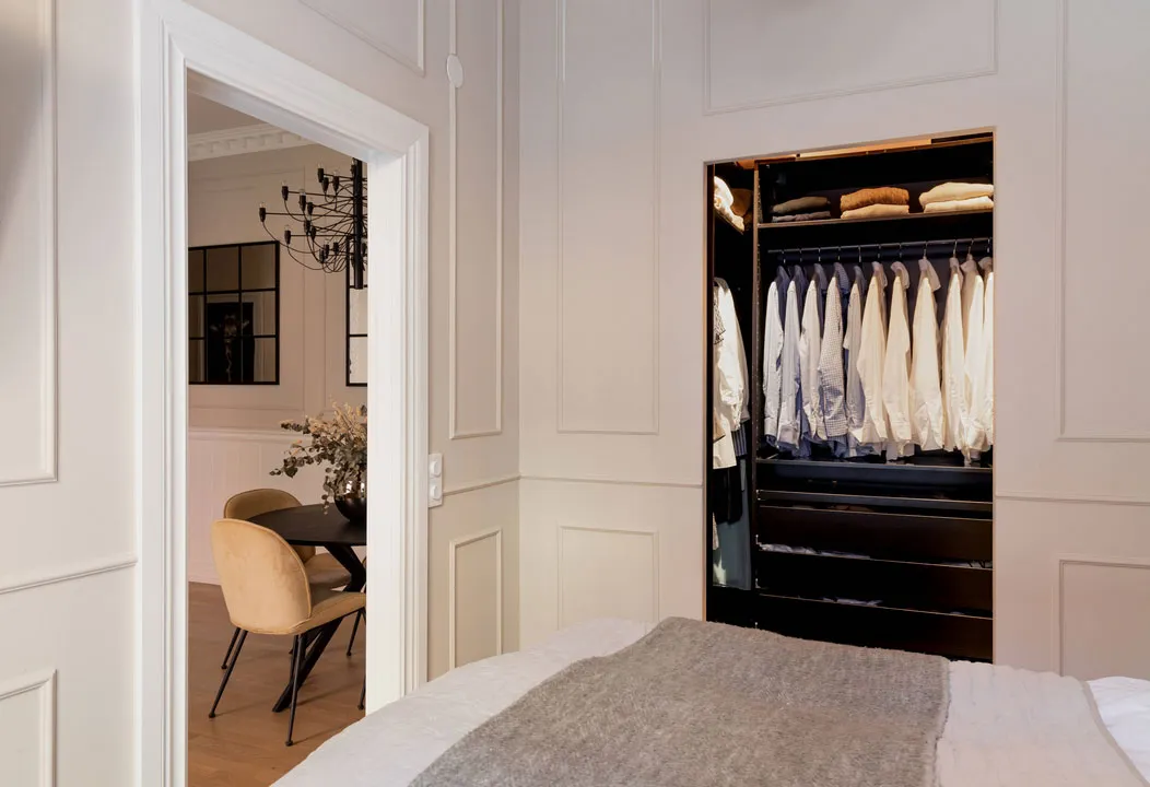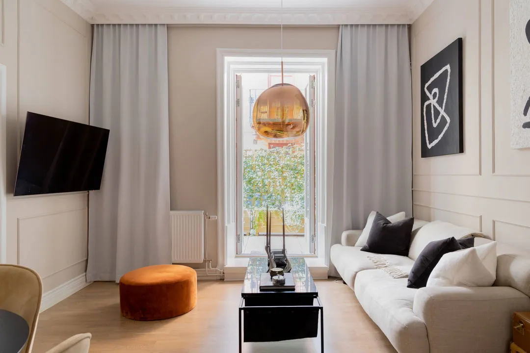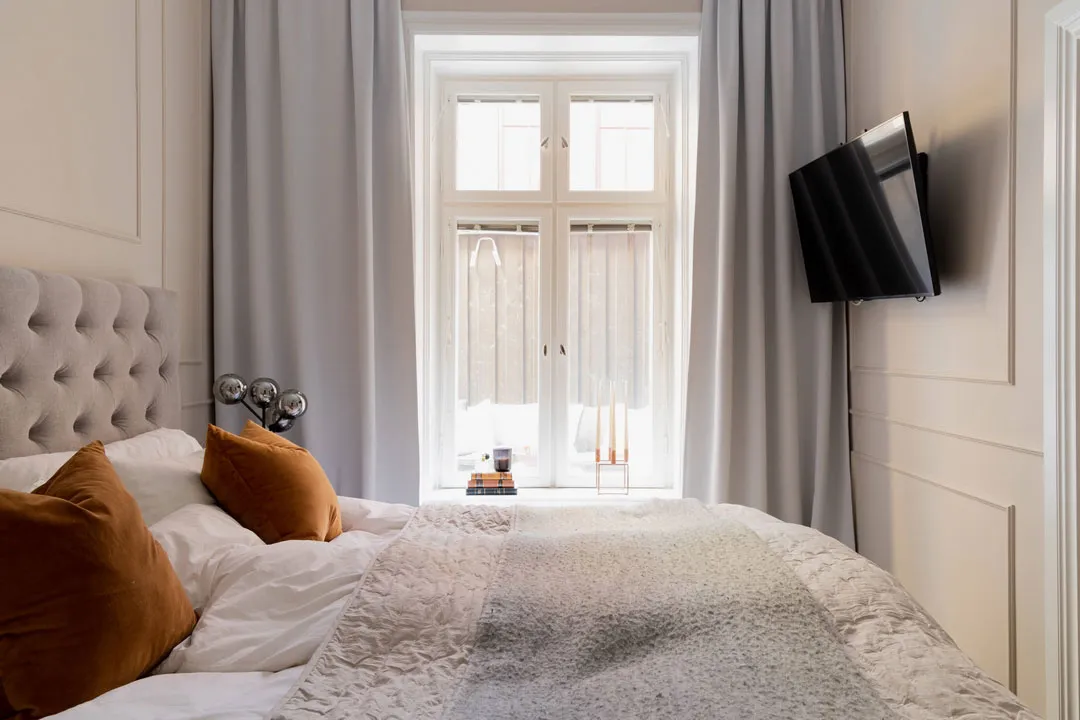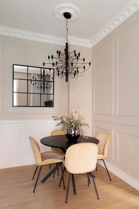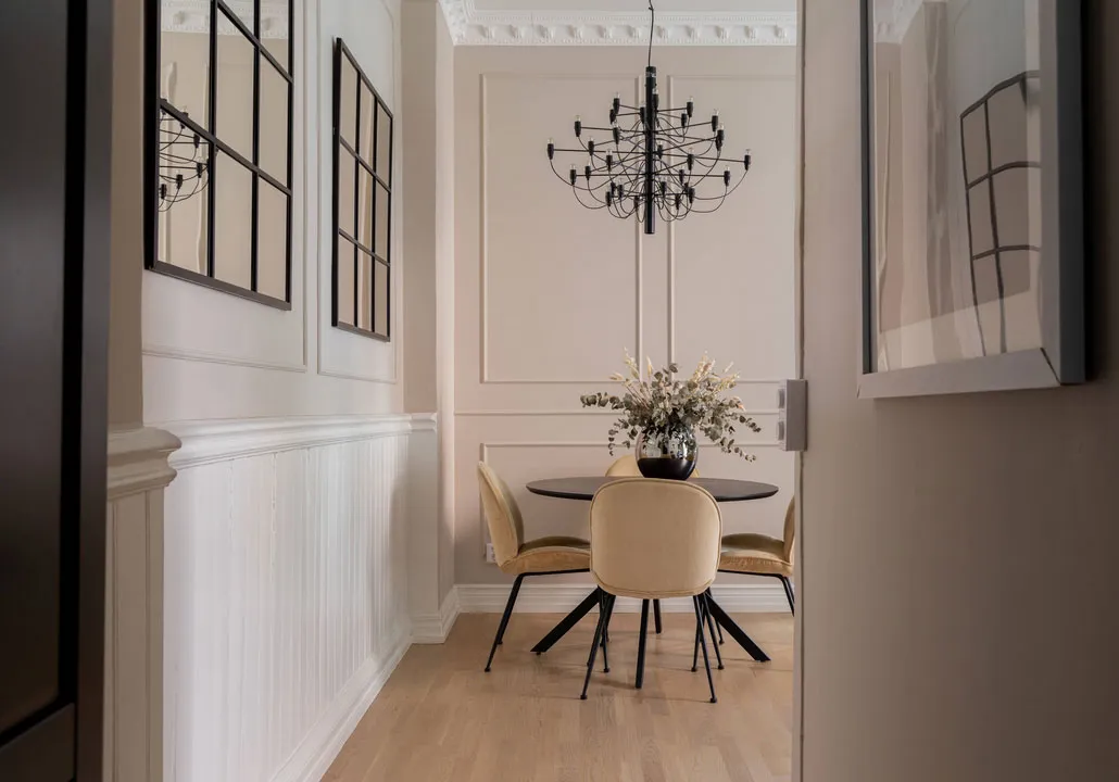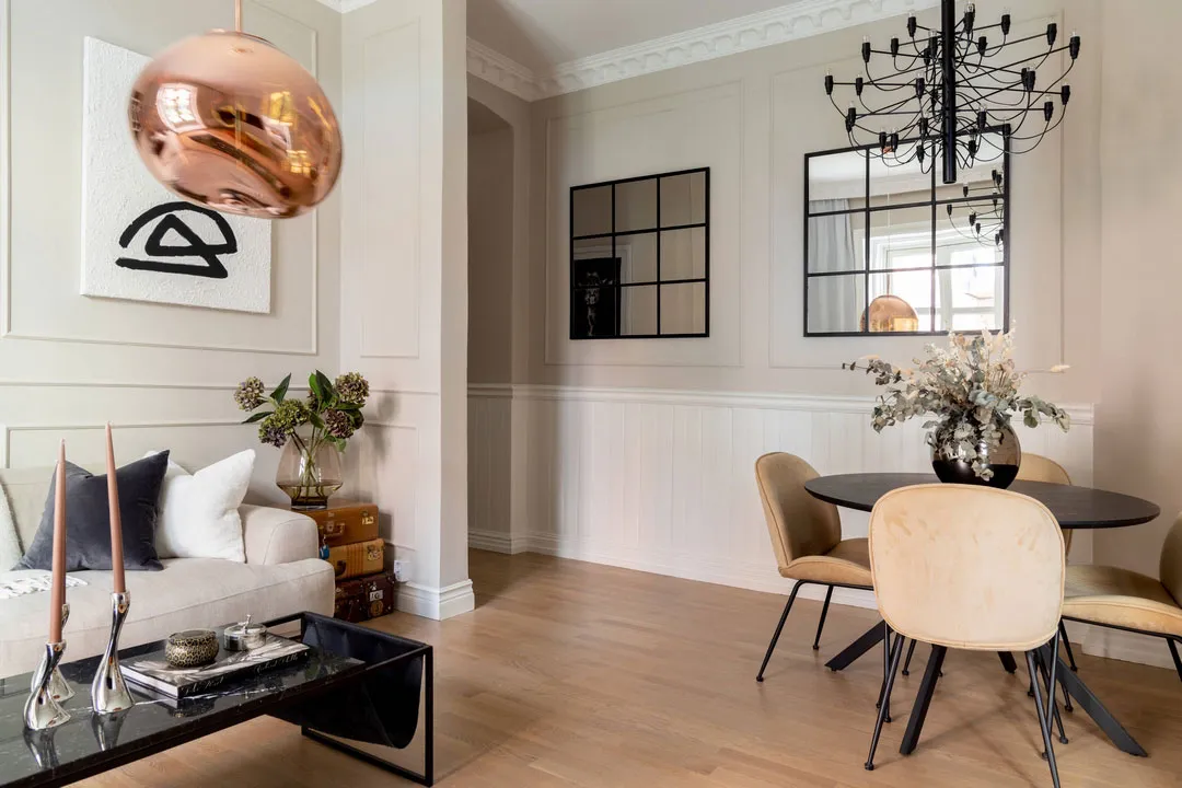 Stil und Charakter in dieser schwedischen Wohnung werden durch klassische Moldingen geprägt – das Wohnzimmer und Schlafzimmer wirken sehr elegant, aber gleichzeitig modern durch die Möbel und Dekoration.