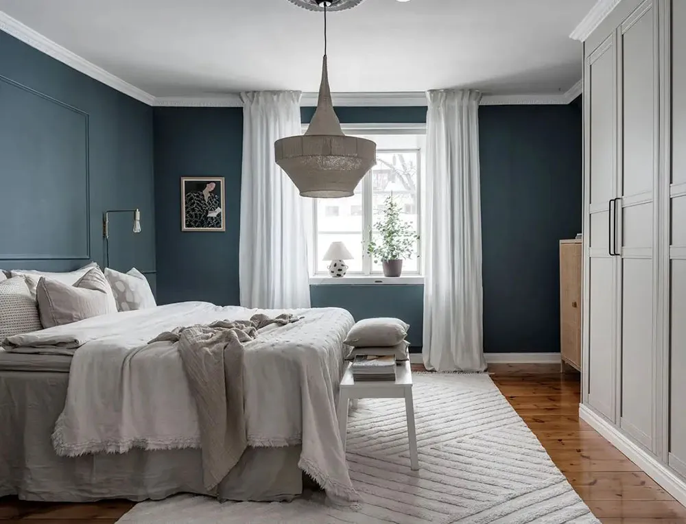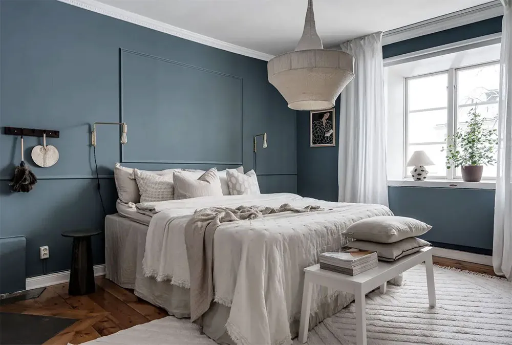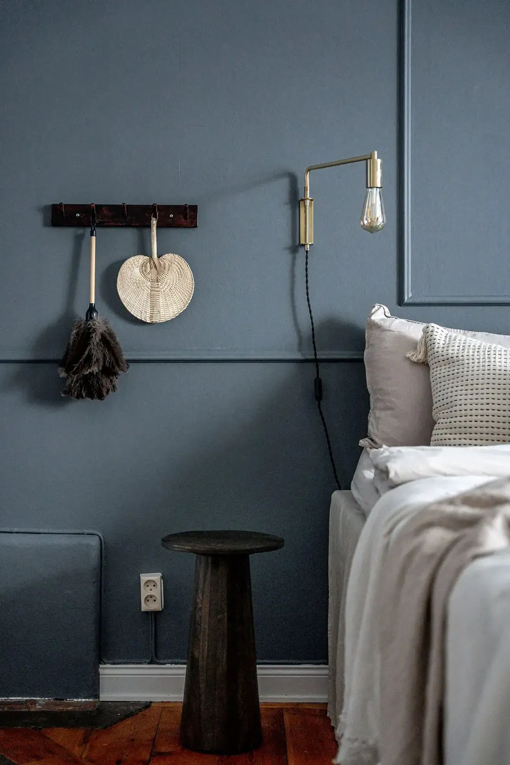 Helle Dachgeschosswohnung in Stockholm mit Balken und blauer Schlafzimmer