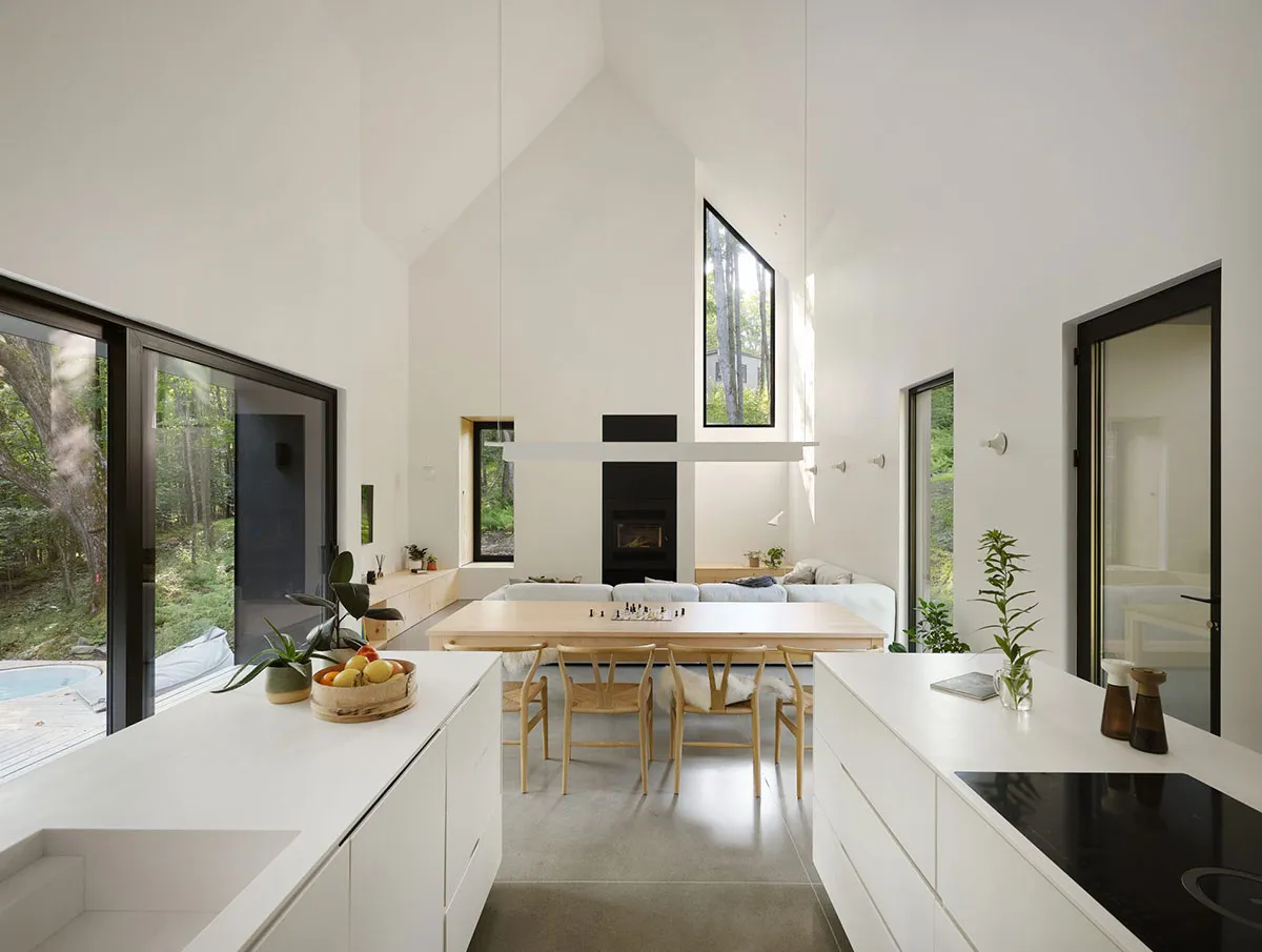 Stylischer Holzhütte im Wald mit hellen modernen Interieurs