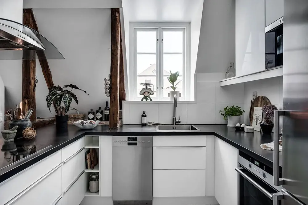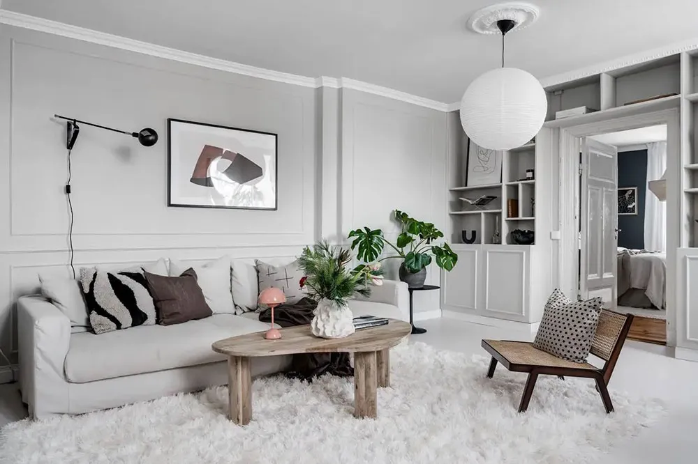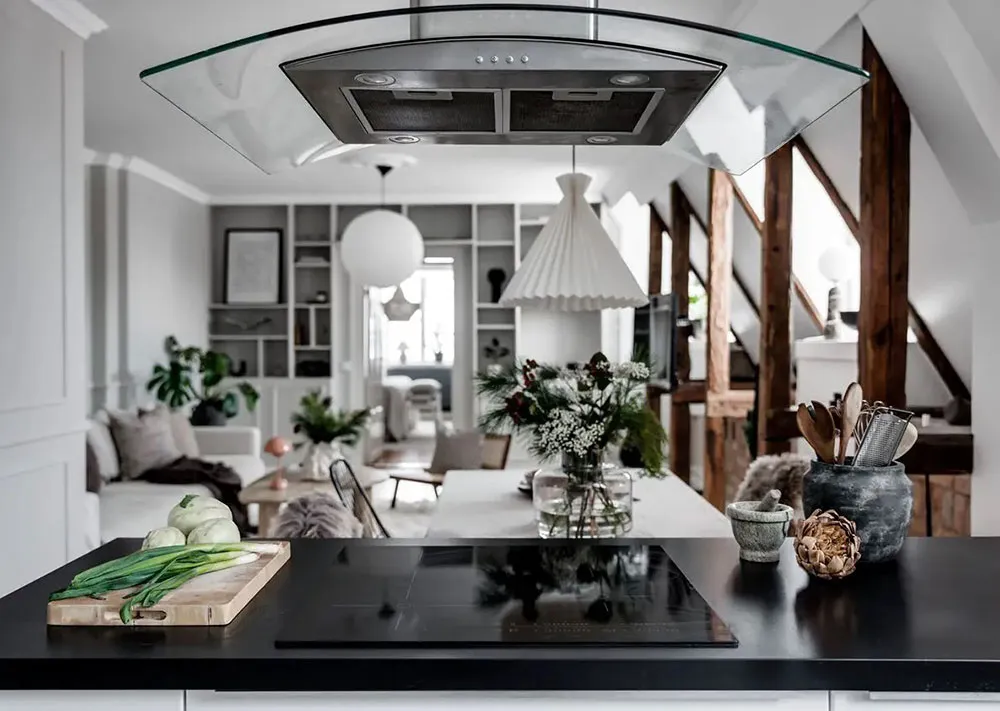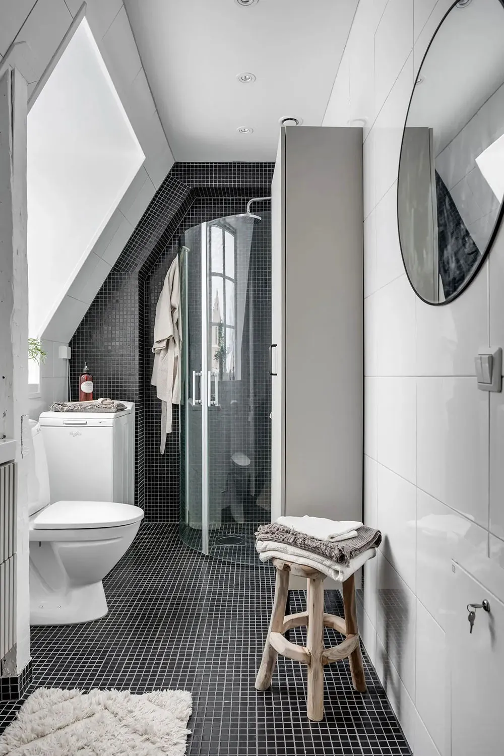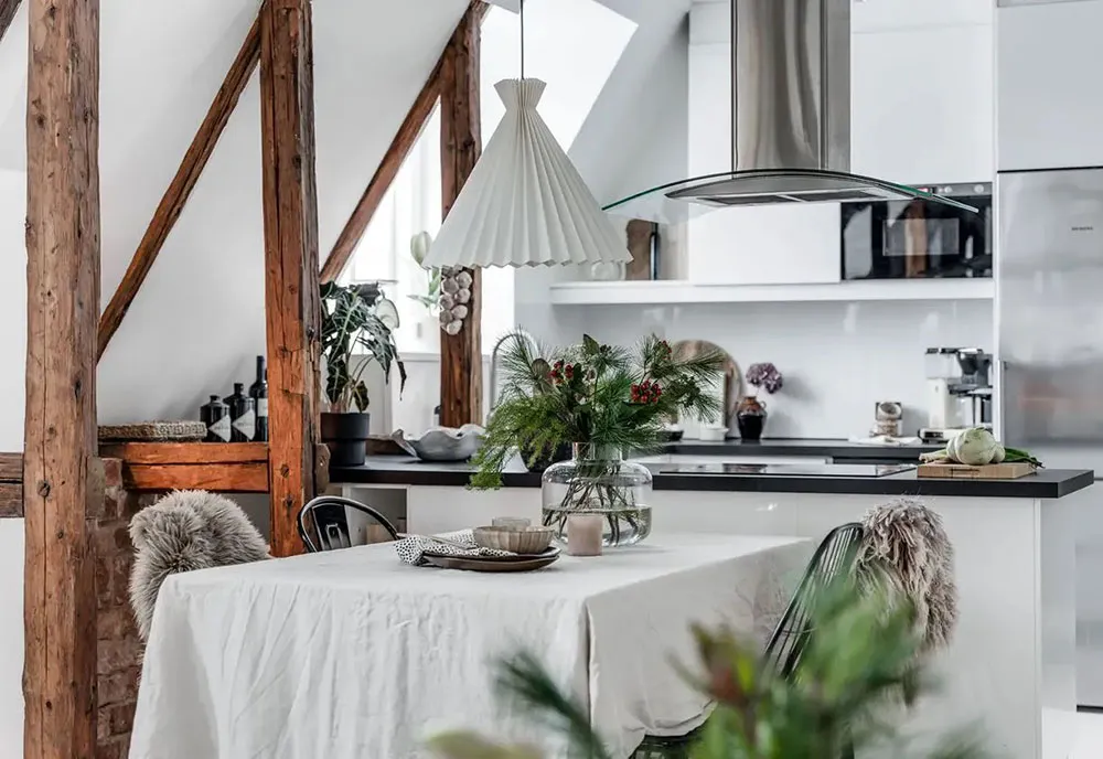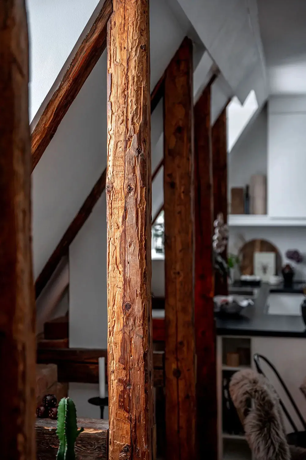 In dieser Dachgeschosswohnung in Stockholm fehlen keine atemberaubenden Deckenhöhen, wie sie oft in Dachraumräumen vorkommen, doch originelle Holzbalken und abgeschrägte Wände verleihen den Innenräumen Individualität.