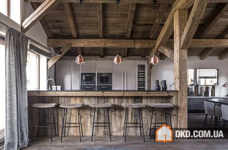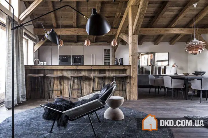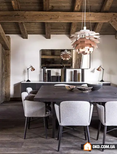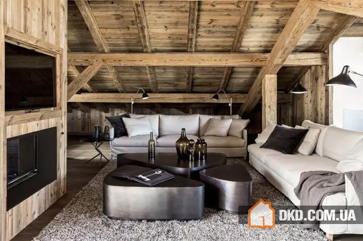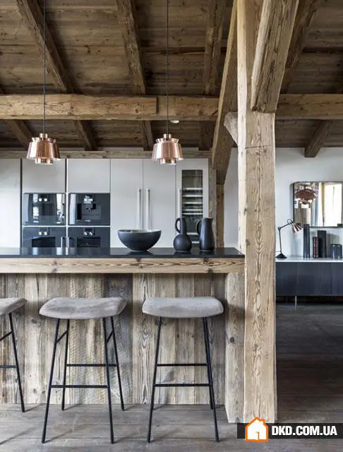Oft stehen Eigentümer von Häusern vor der Diilemma zwischen dem Stil des Inneneinrichtungs: entweder auf Holztextur oder im Stil einer städtischen Wohnung zu gestalten. Dieses Schalé in den französischen Alpen ist ein komplexer und herausragender Kompromiss. Versuchen Sie, mit der Hand die obere Hälfte des Bildes zu verschließen – Sie befinden sich dann in einer Wohnung mit kühler Farbpalette und strenger Linie. Vielleicht erscheint es manchen nicht warm und gemütlich. Schließen Sie nun die untere Hälfte des Fotos – Sie befinden sich sofort in einem alpinen Schalé mit sehr angenehmer Lamellenatmosphäre. Vielleicht fehlen Ihnen Designstühle und modisches Textil. Schauen Sie nun insgesamt auf das Bild – die Teile des Interieurs ergänzen sich perfekt: Wärme des Holzes und Eleganz des Metalls schaffen einzigartiges Interieur. Ein Interieur, einfach in seiner Grundlage, aber erstaunlich durchdacht.