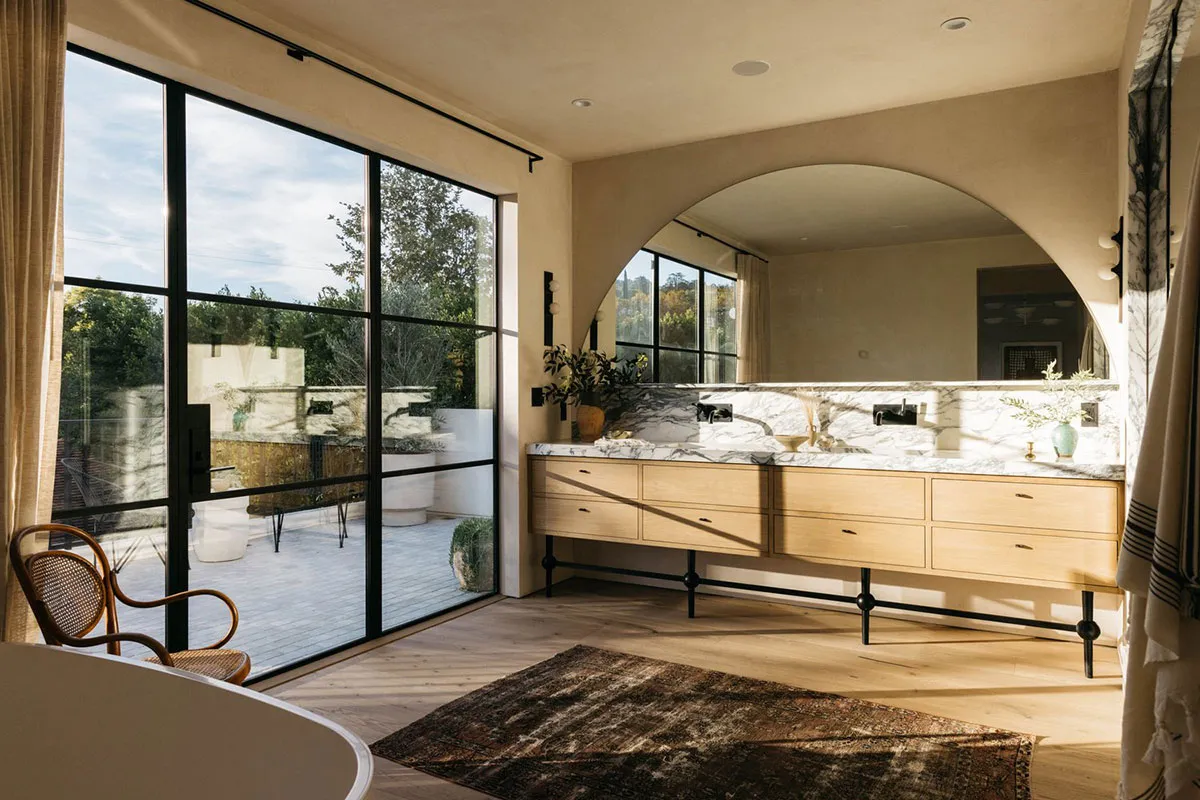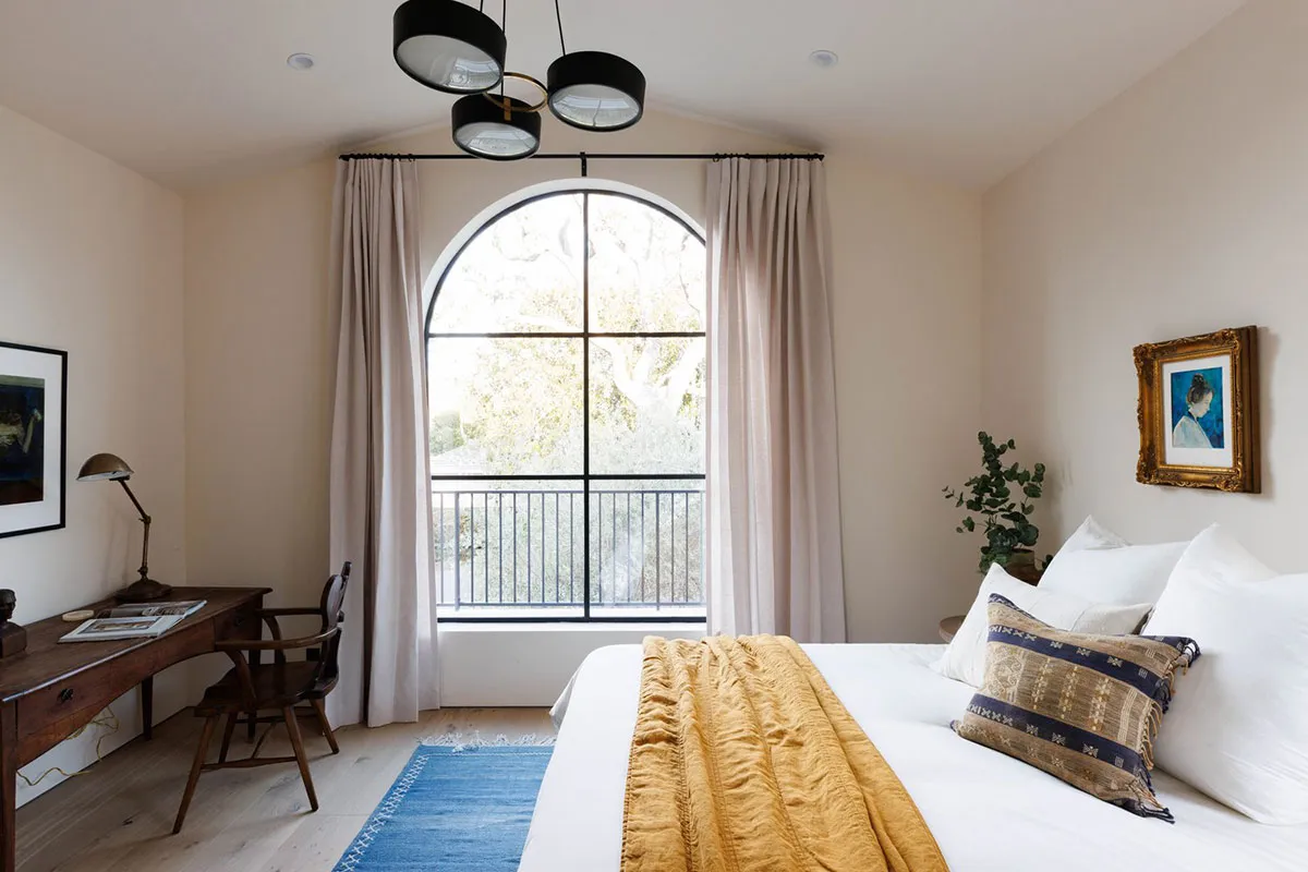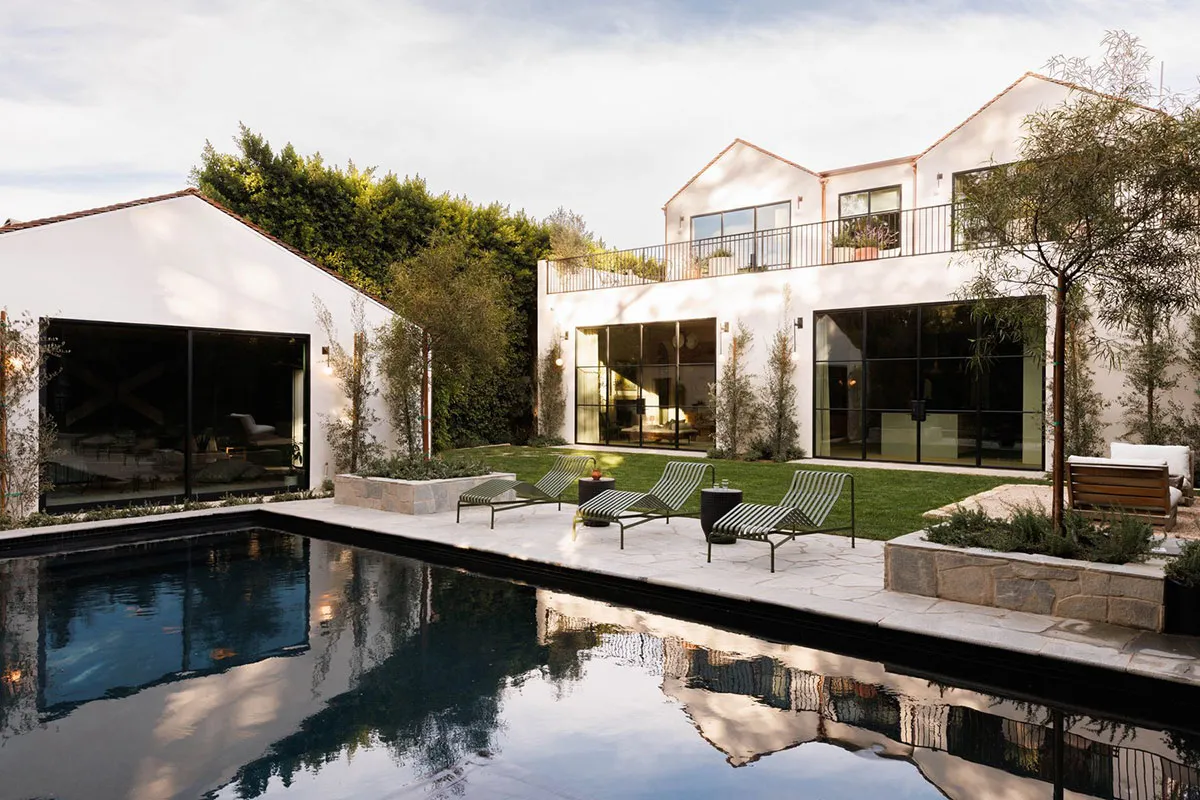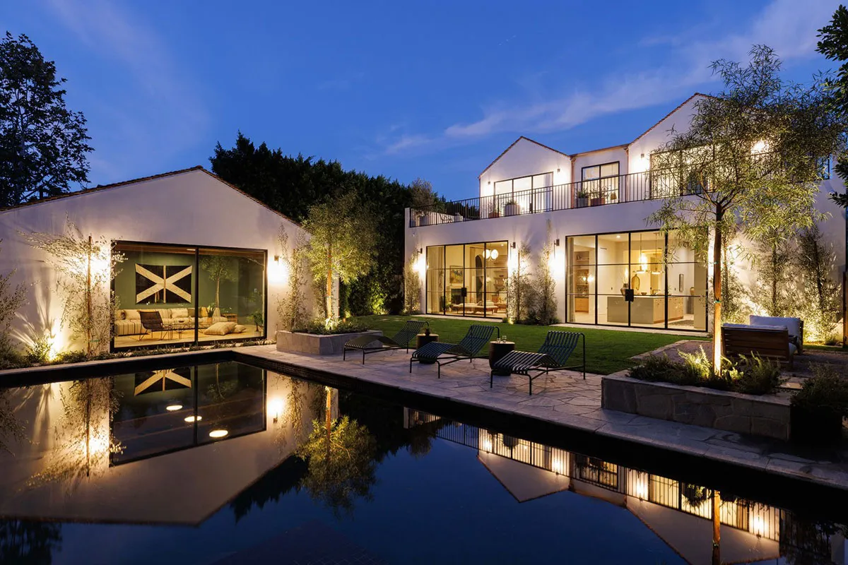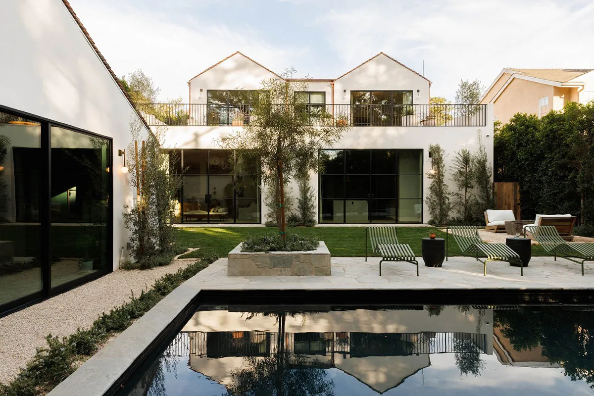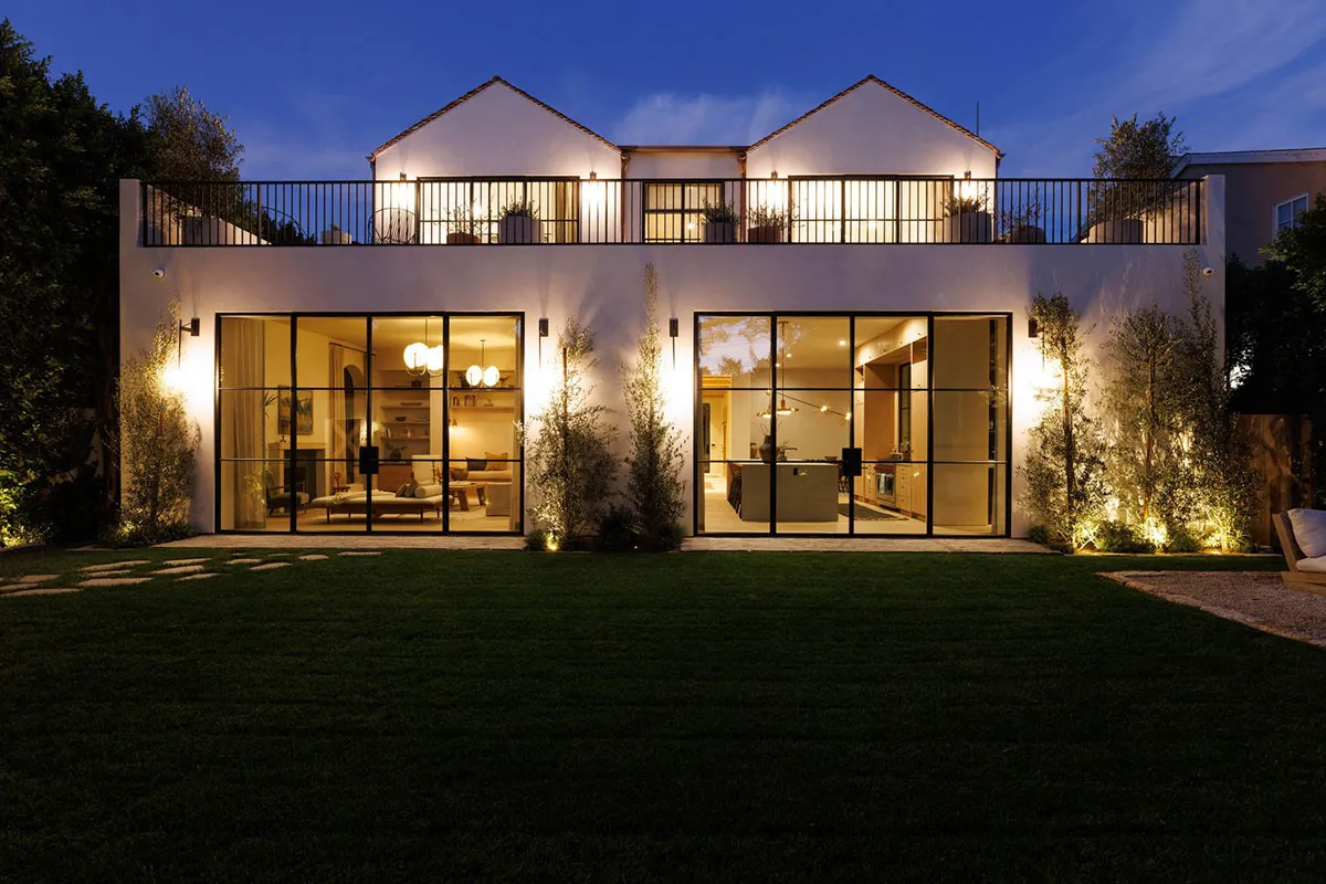 In den äußeren Formen dieses modernen Hauses in Los Angeles lässt sich leicht der starke mediterrane Einfluss erkennen: charakteristische bogenförmige Fenster, Rolläden, weiße Fassaden.