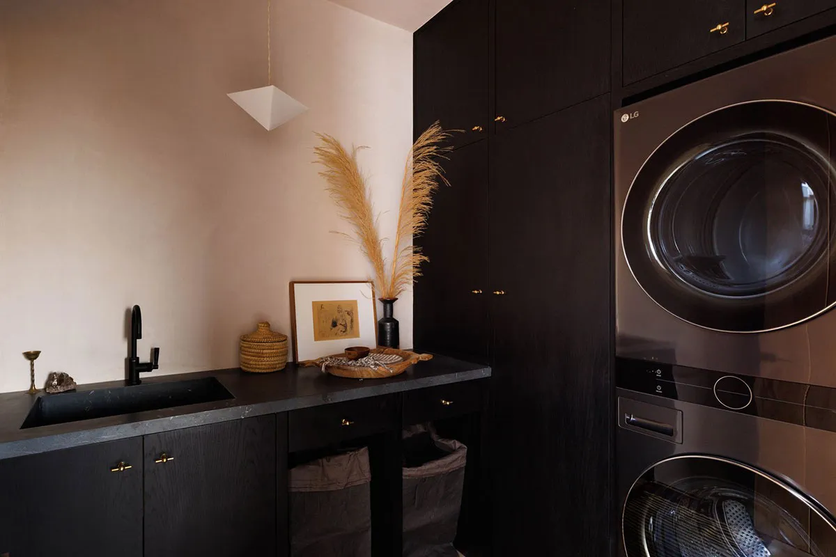 Sehr helle Interieurs eines modernen schwarzen Landhauses in der Natur